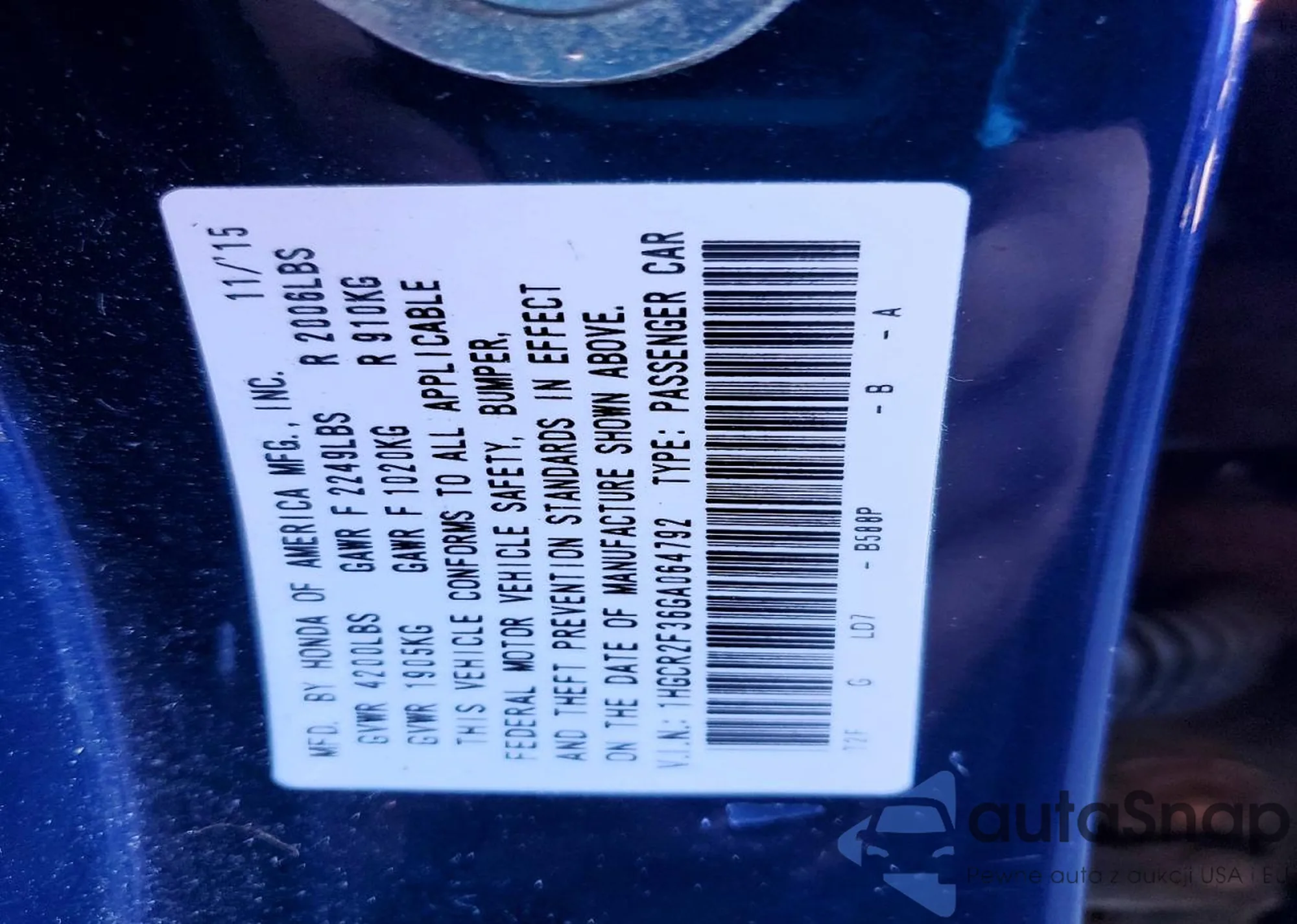 • VIN 1HGCR2F36GA064792
