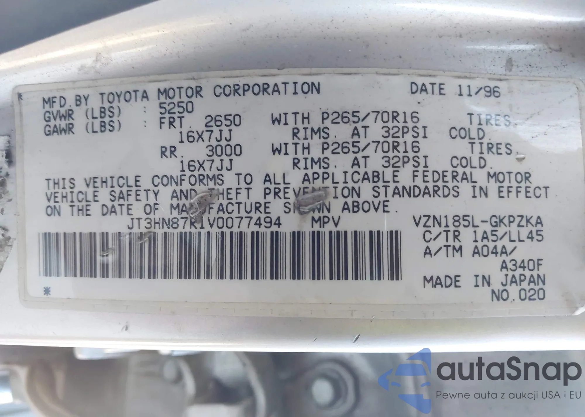 LOT: 44069750 VIN: JT3HN87R1V0077494