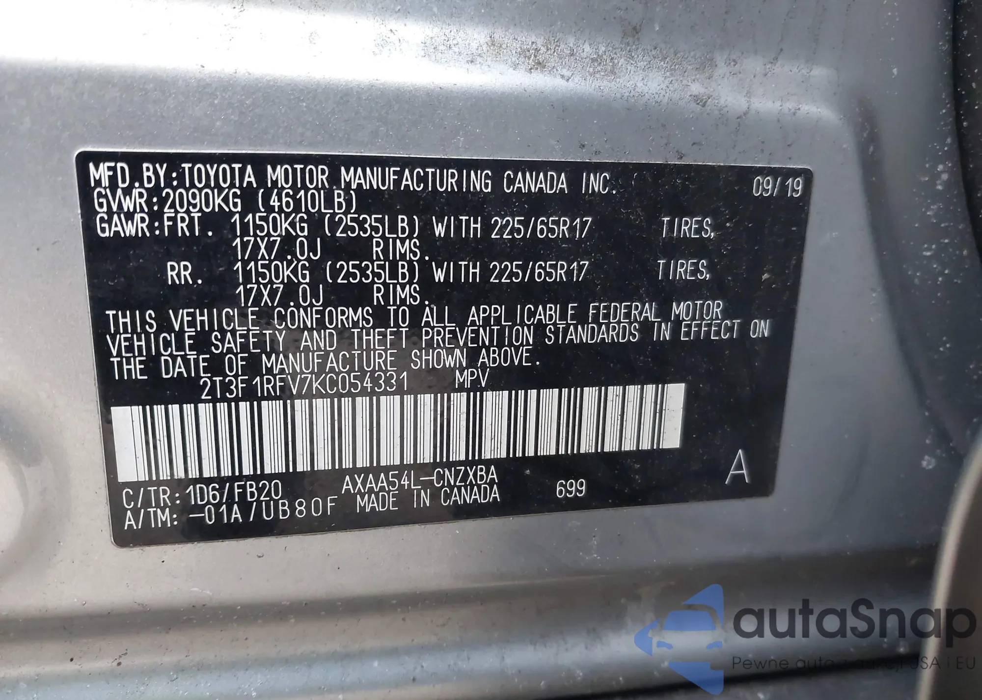 LOT: 44029341 VIN: 2T3F1RFV7KC054331