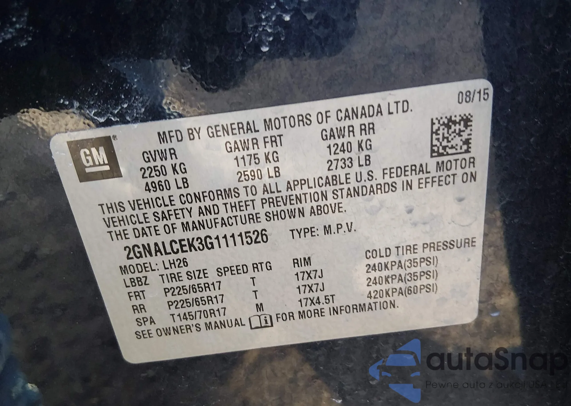 • VIN 2GNALCEK3G1111526