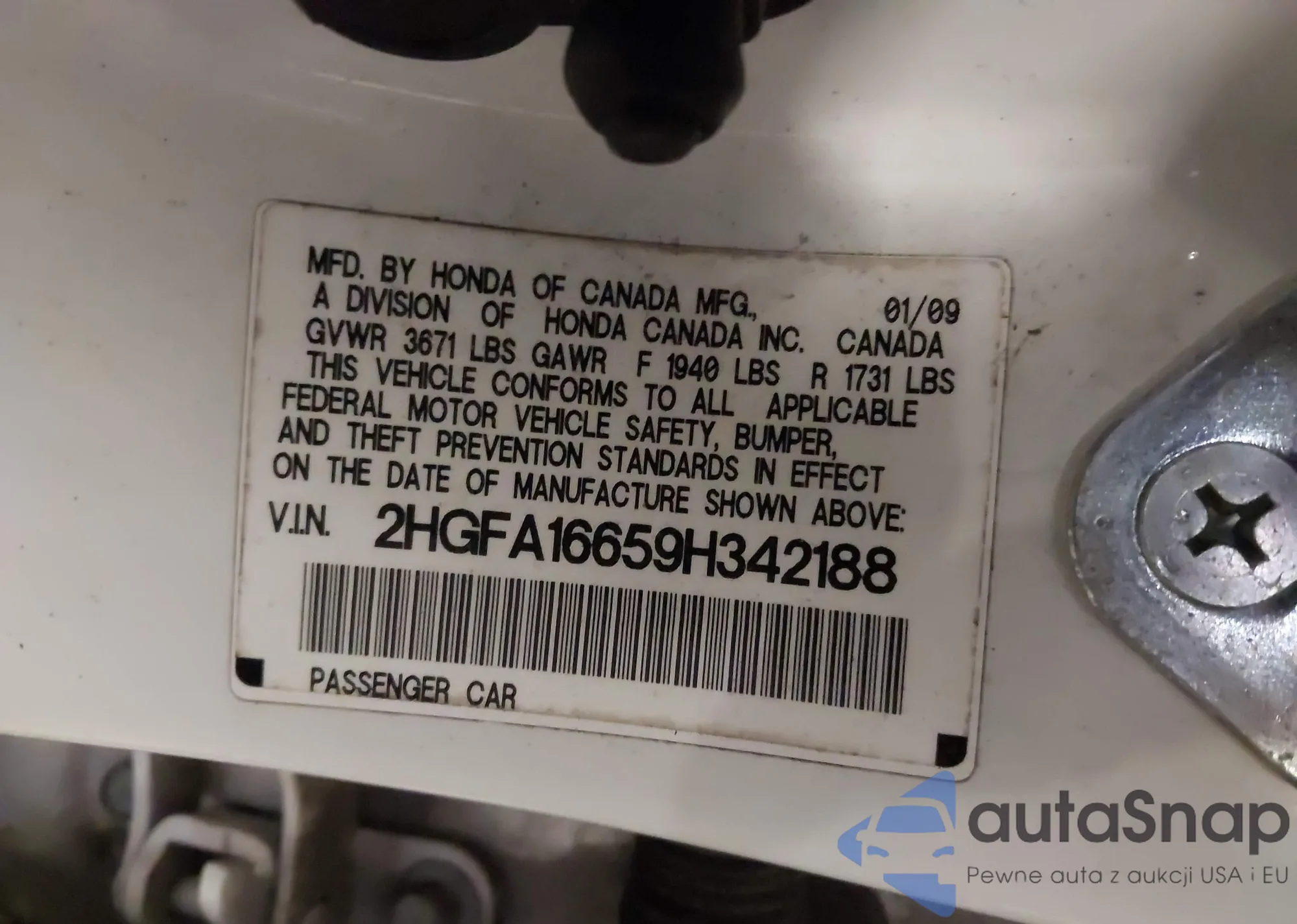 LOT: 43820549 VIN: 2HGFA16659H342188