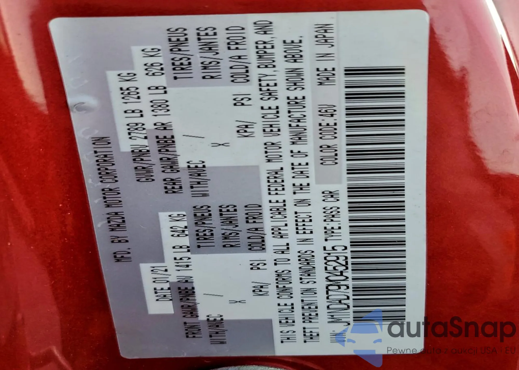 LOT: 95406515 VIN: JM1NDAD79M0452915