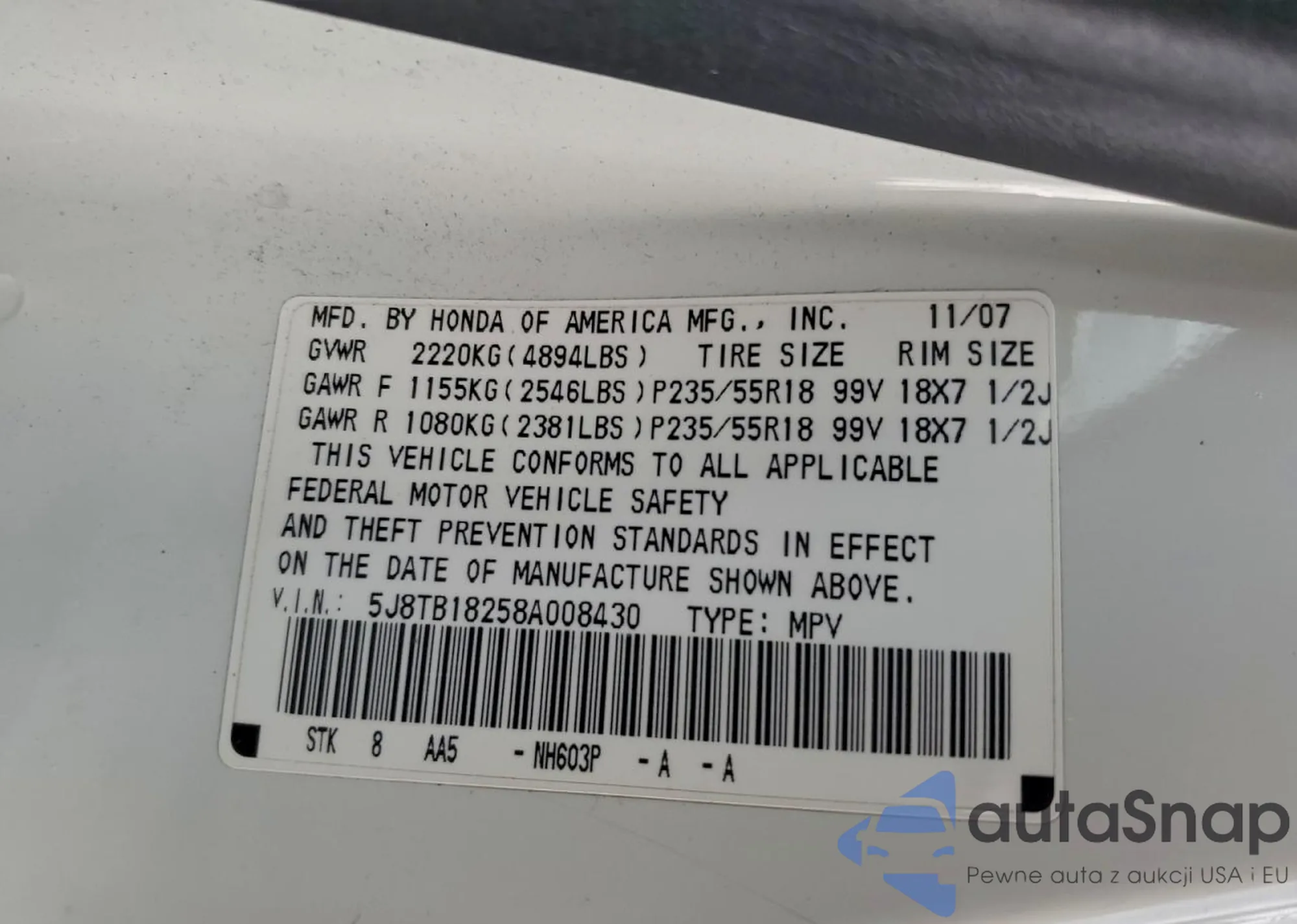 • VIN 5J8TB18258A008430