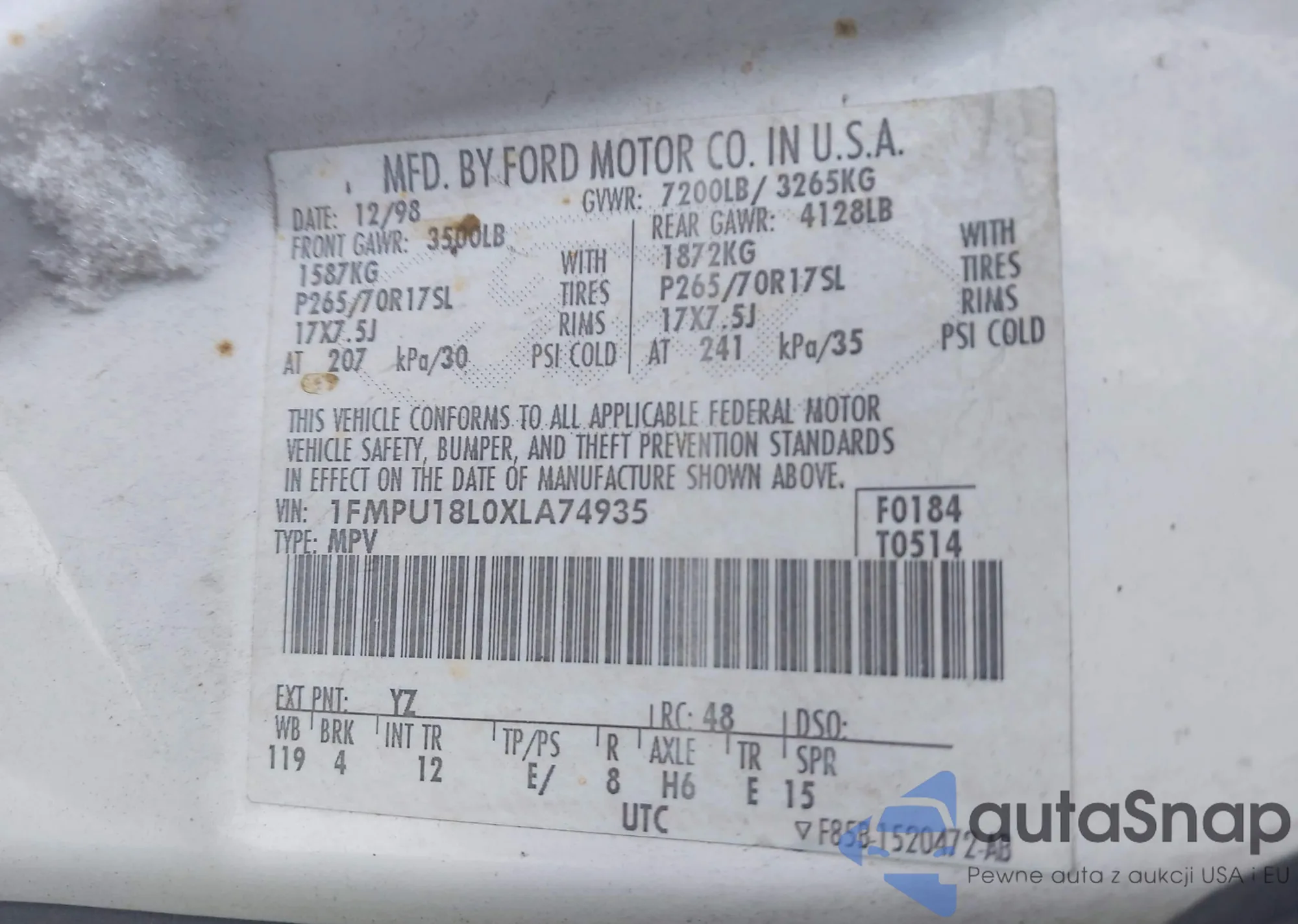 • VIN 1FMPU18L0XLA74935