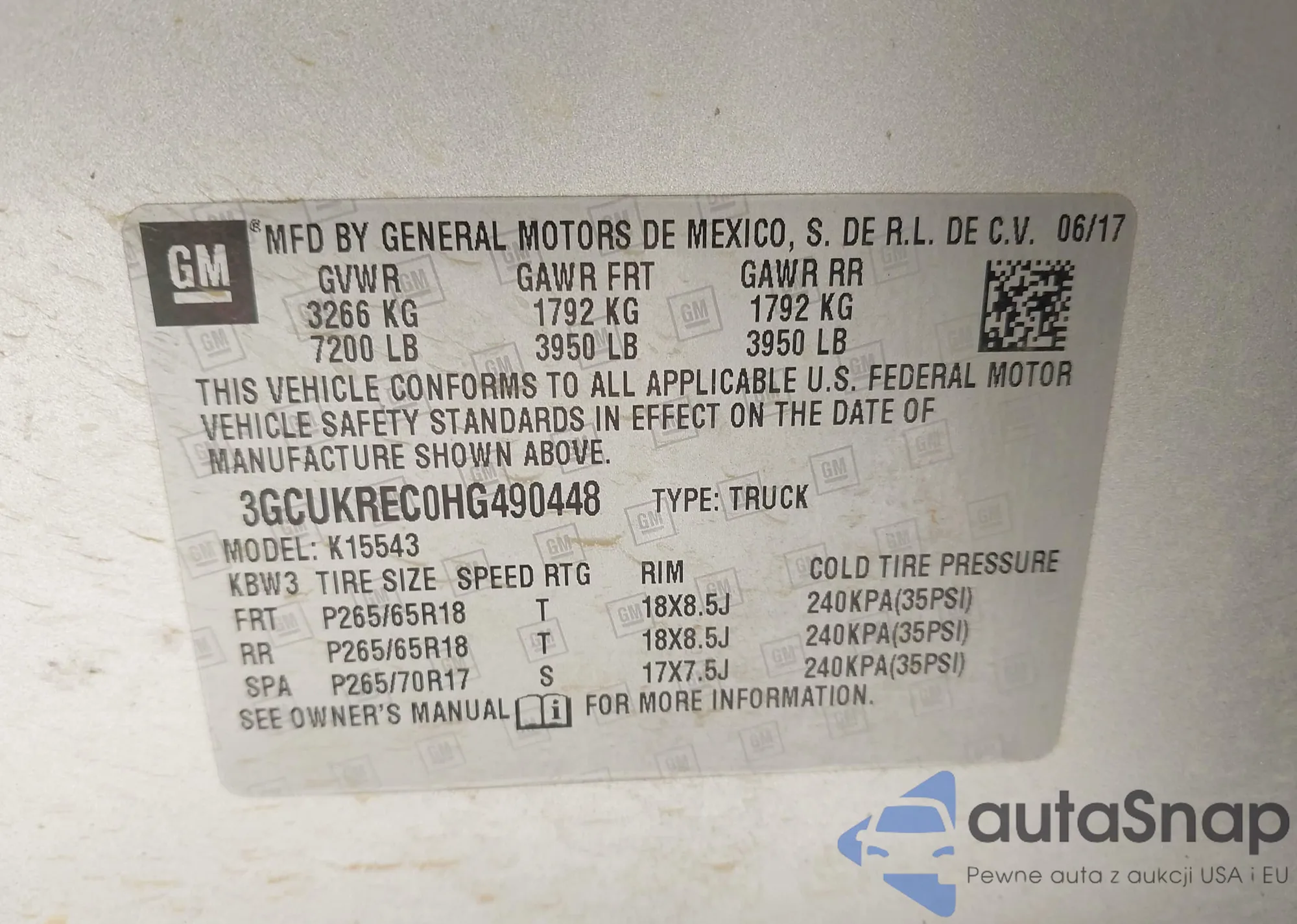 LOT: 43894053 VIN: 3GCUKREC0HG490448