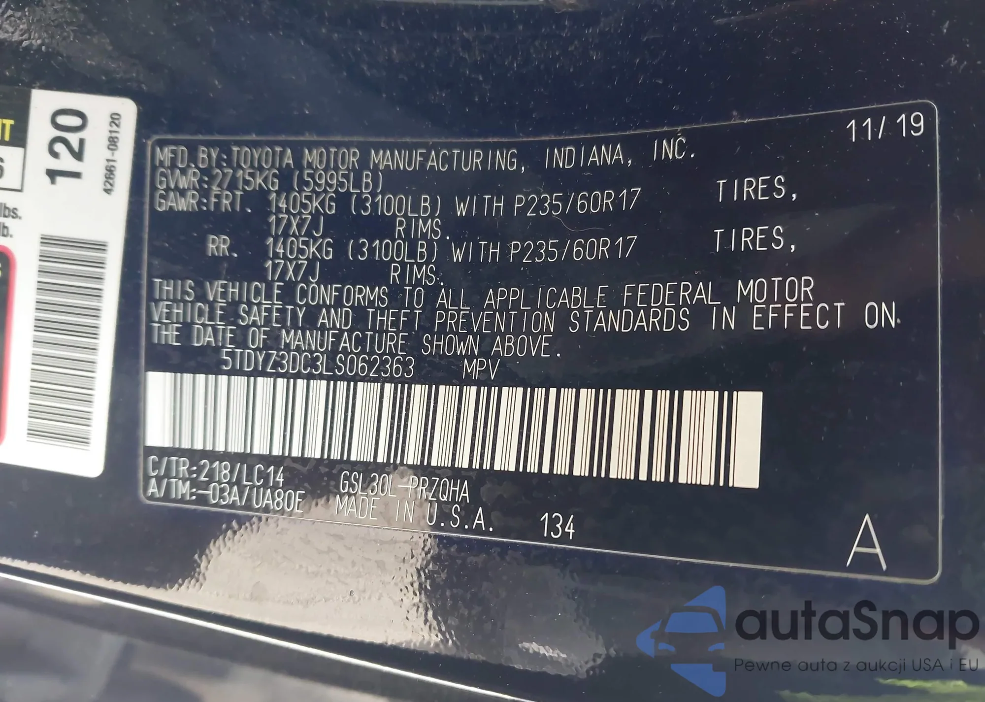• VIN 5TDYZ3DC3LS062363