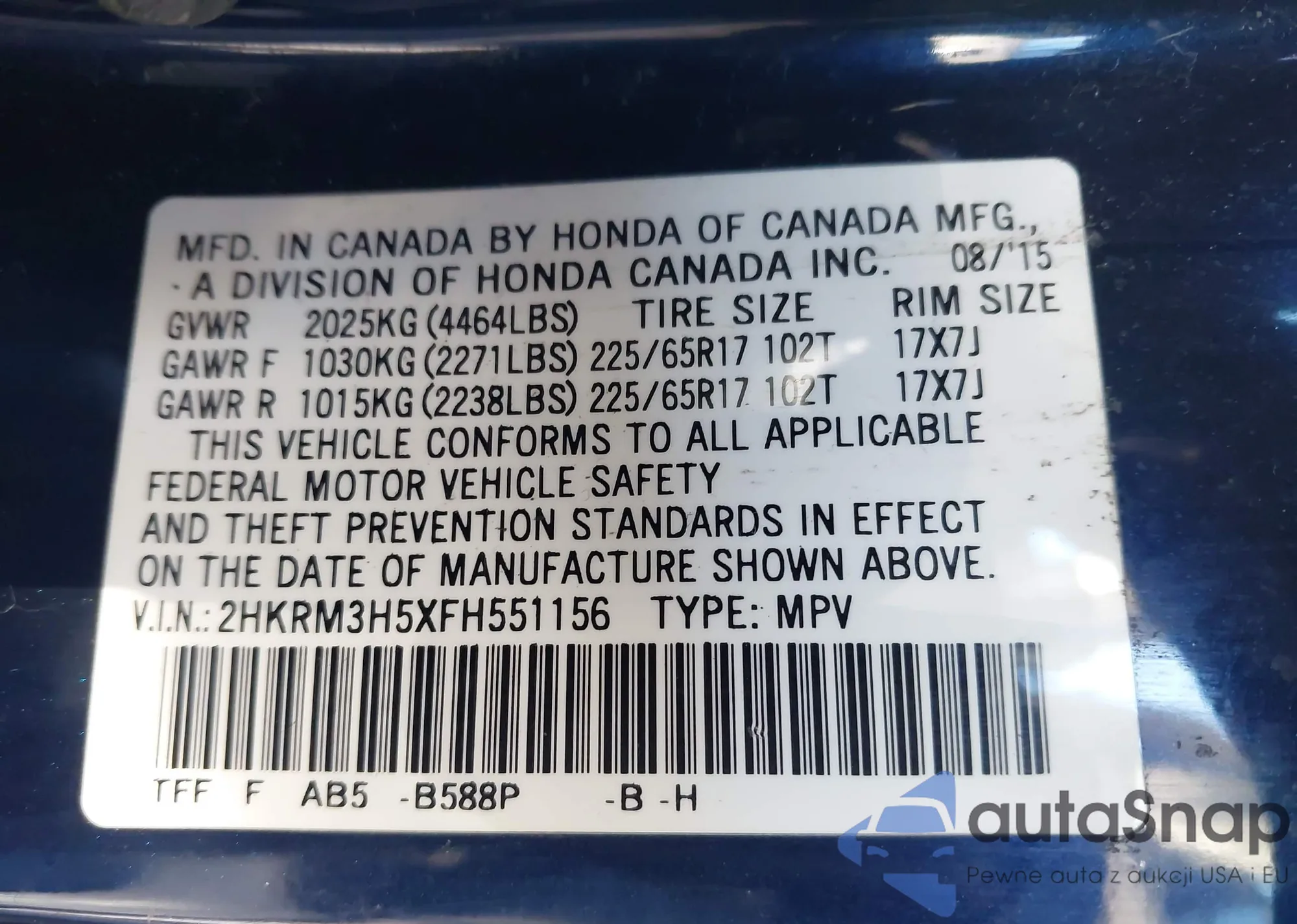 • VIN 2HKRM3H5XFH551156