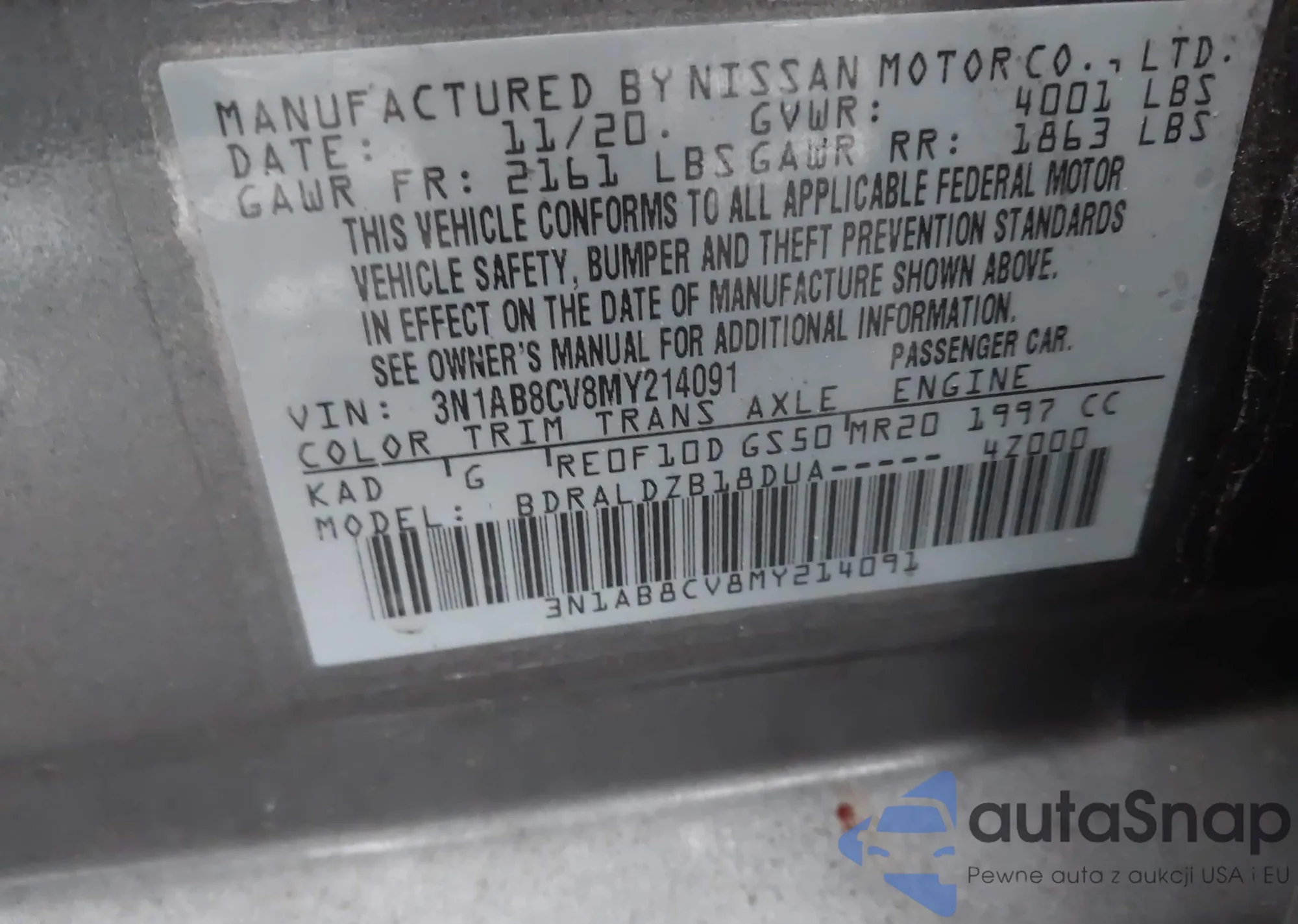 • VIN 3N1AB8CV8MY214091