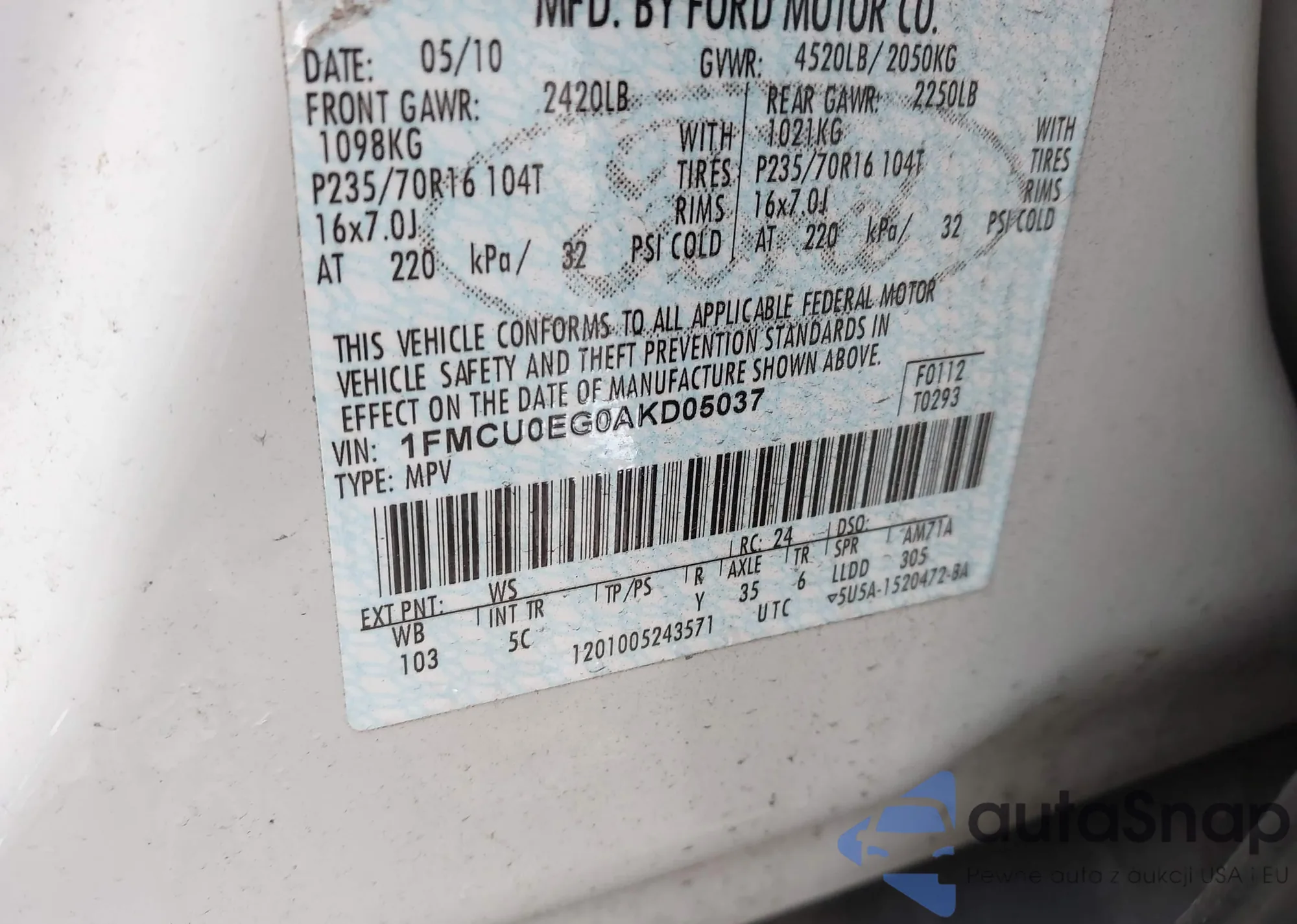 LOT: 43993948 VIN: 1FMCU0EG0AKD05037