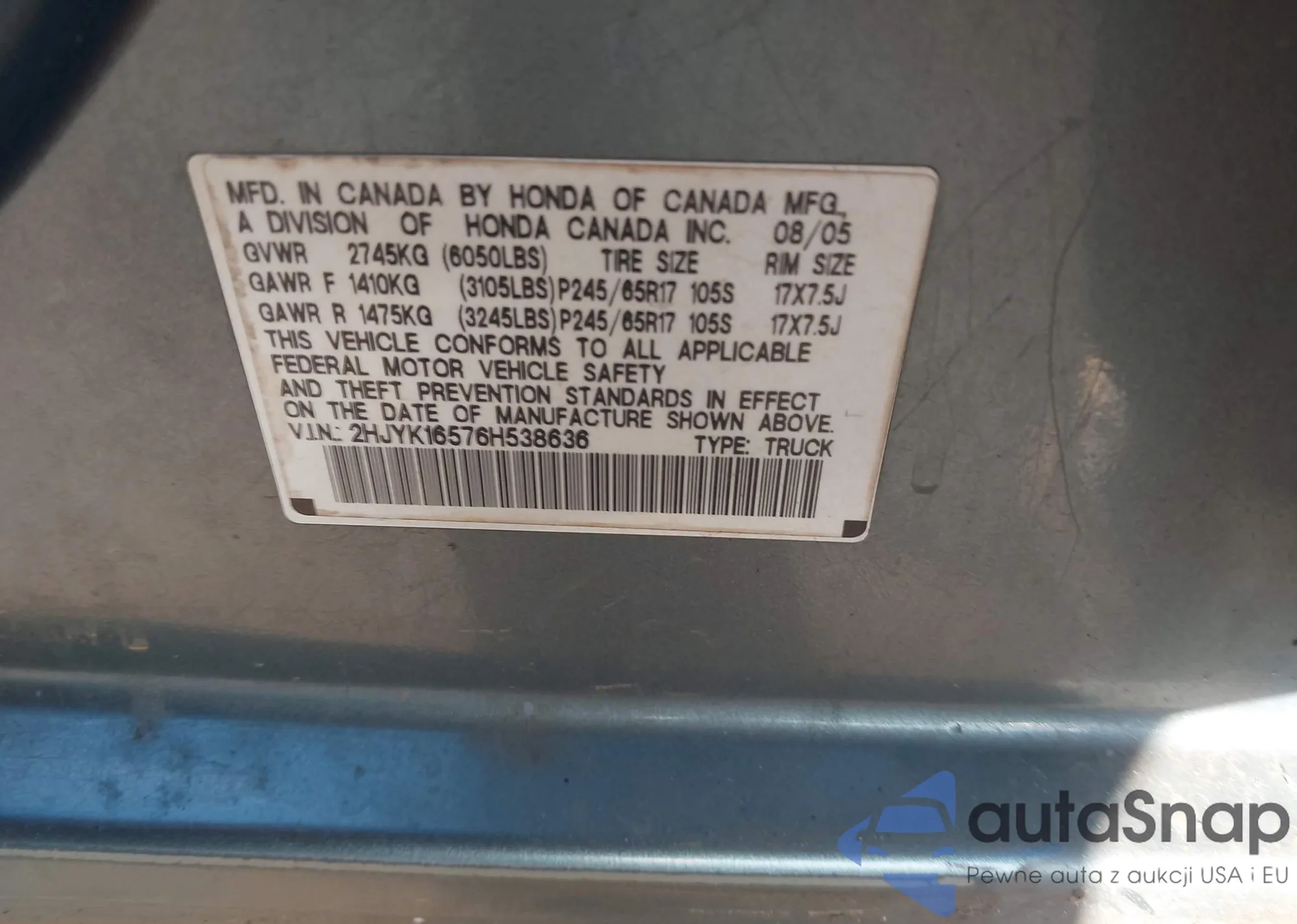 2006 Honda Ridgeline Rtl из США, поврежденный, VIN 2HJYK16576H538636