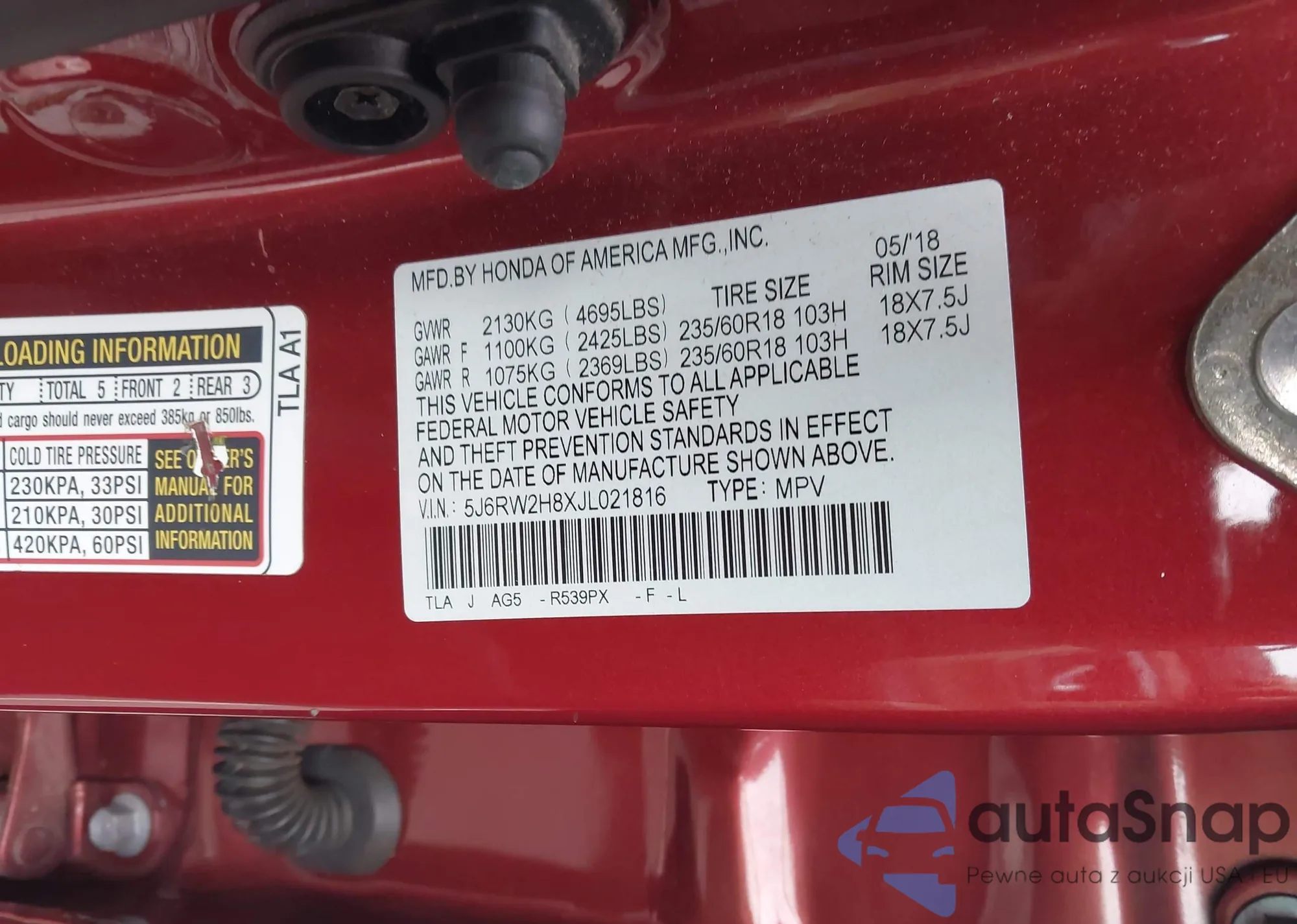 • VIN 5J6RW2H8XJL021816