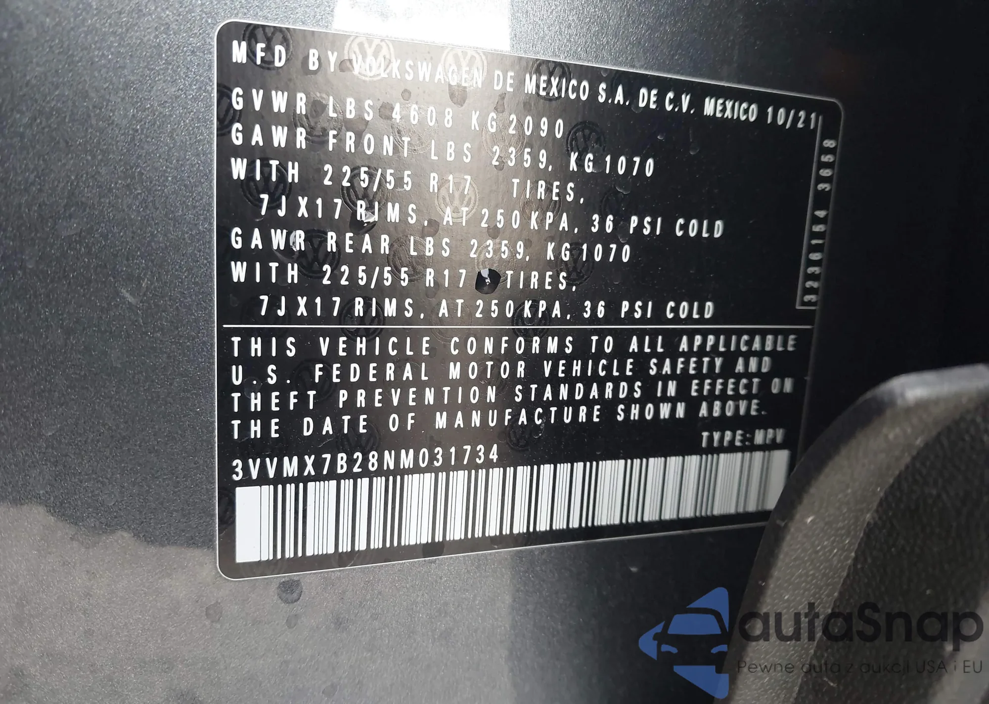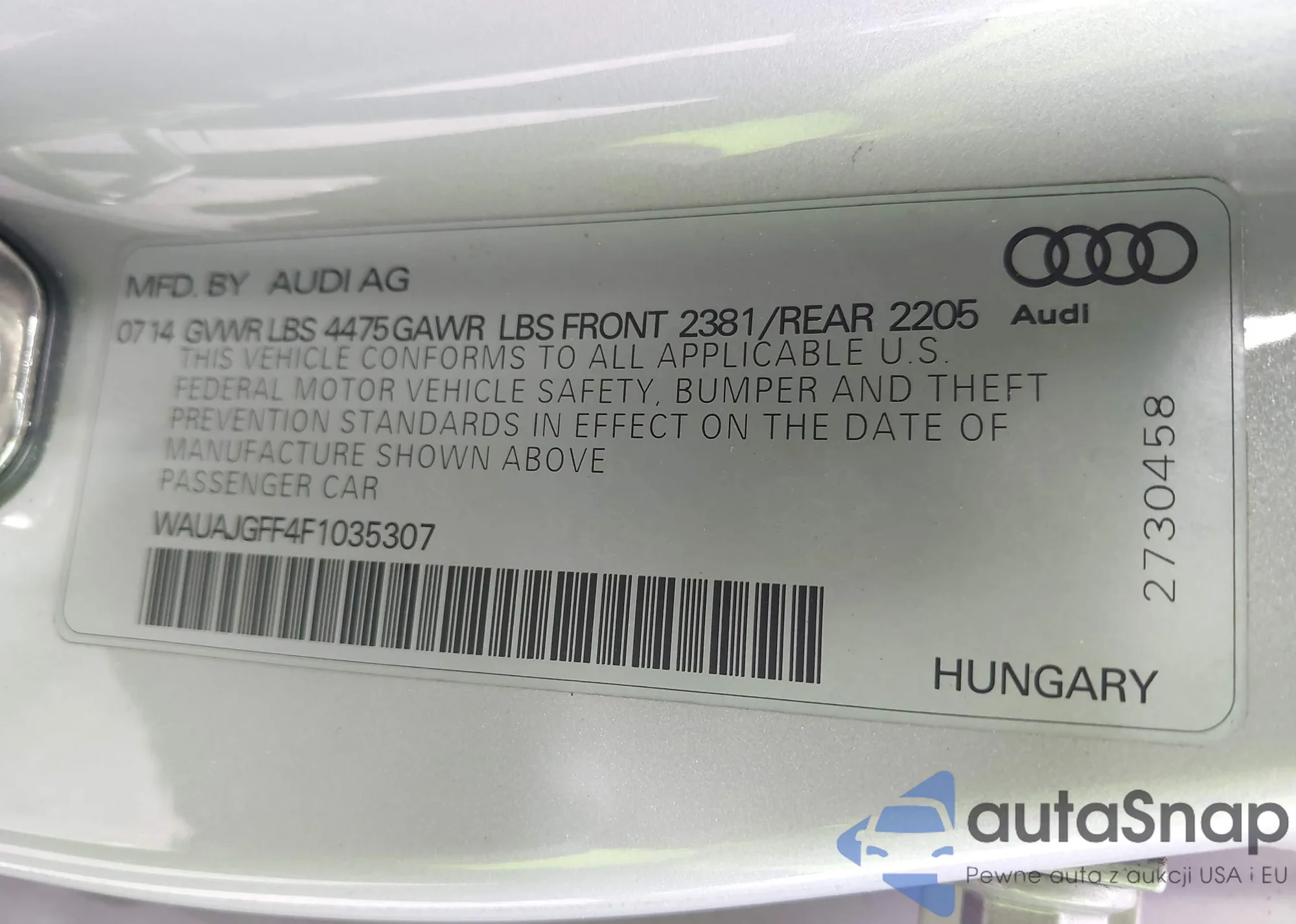 • VIN WAUAJGFF4F1035307
