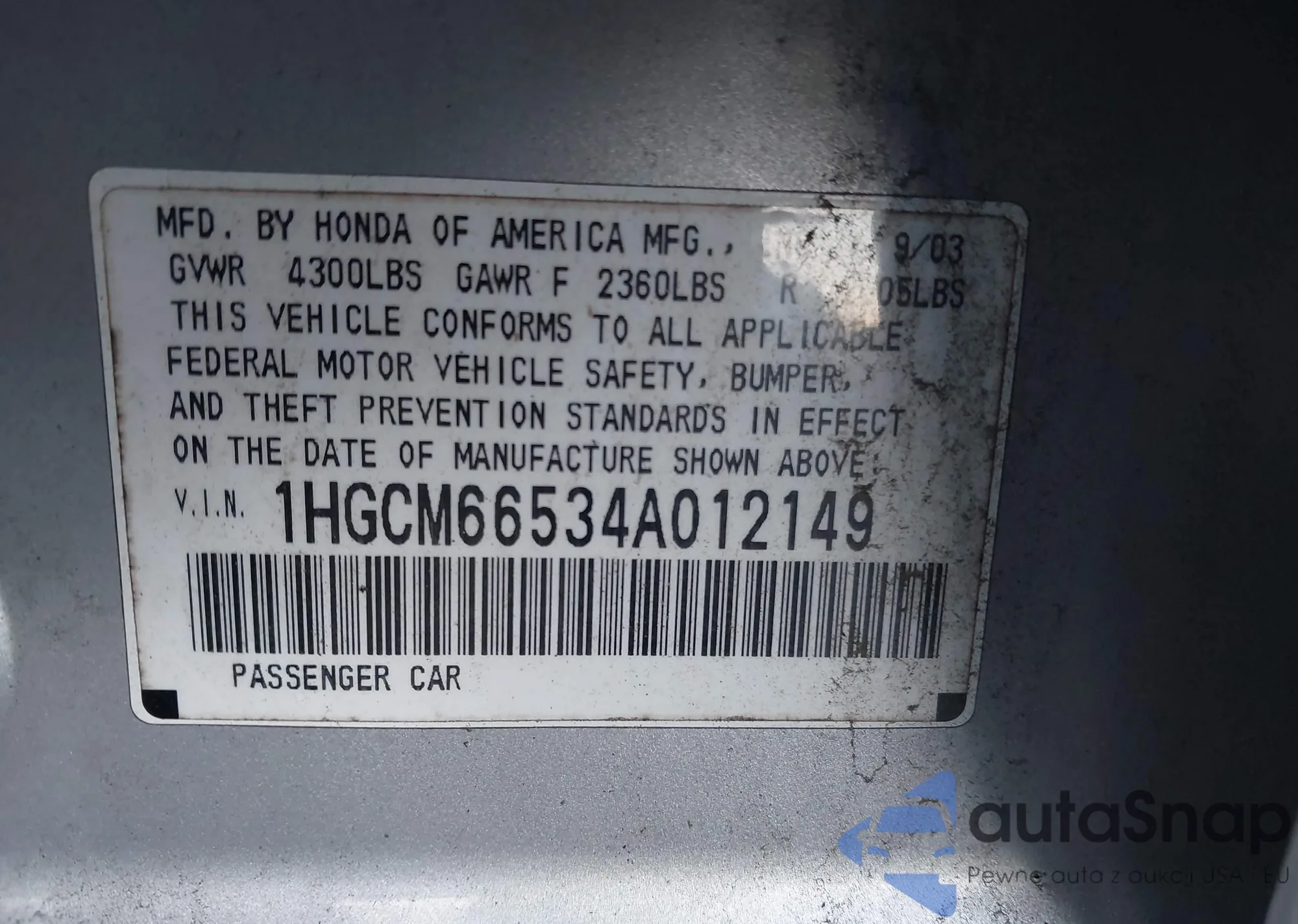 LOT: 44017663 VIN: 1HGCM66534A012149