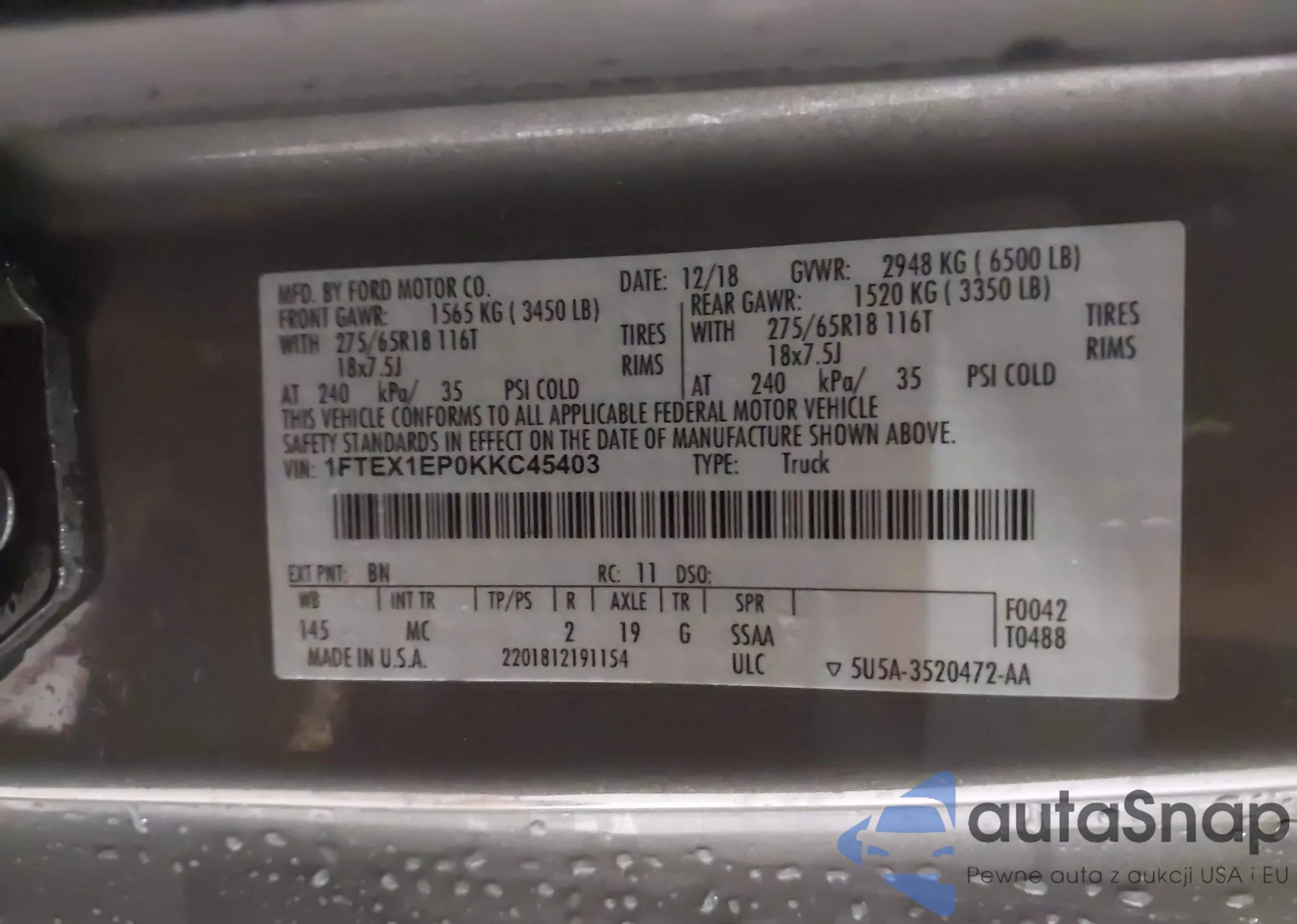 LOT: 43945540 VIN: 1FTEX1EP0KKC45403