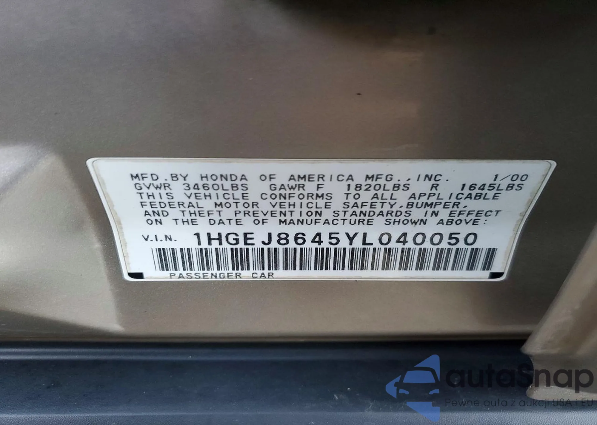 LOT: 72940885 VIN: 1HGEJ8645YL040050