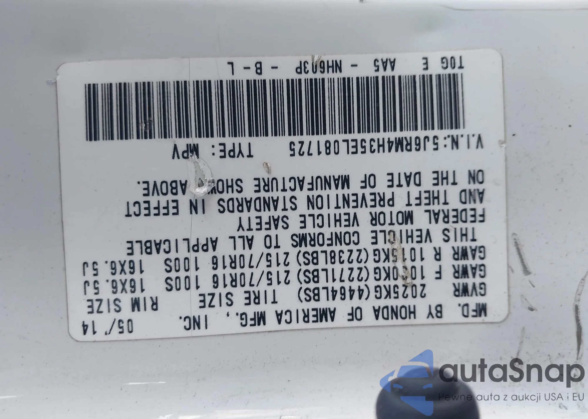 • VIN 5J6RM4H35EL081725