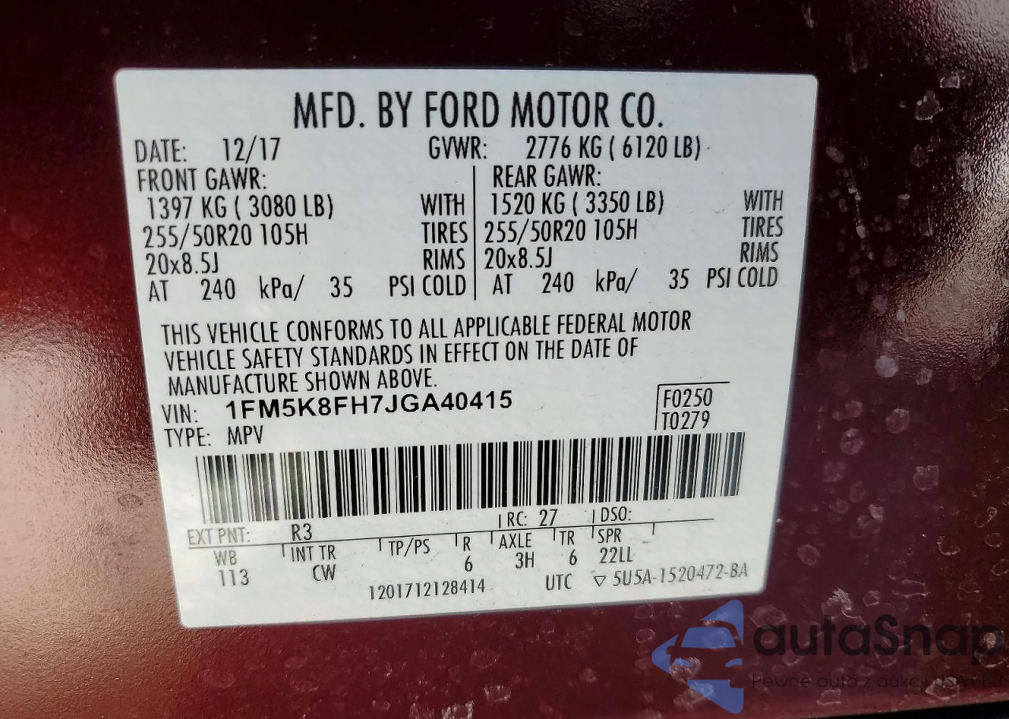 LOT: 72604945 VIN: 1FMHK7F88BGA30310