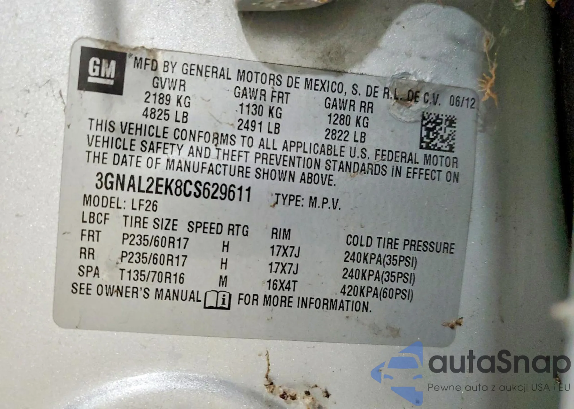 • VIN 3GNAL2EK8CS629611