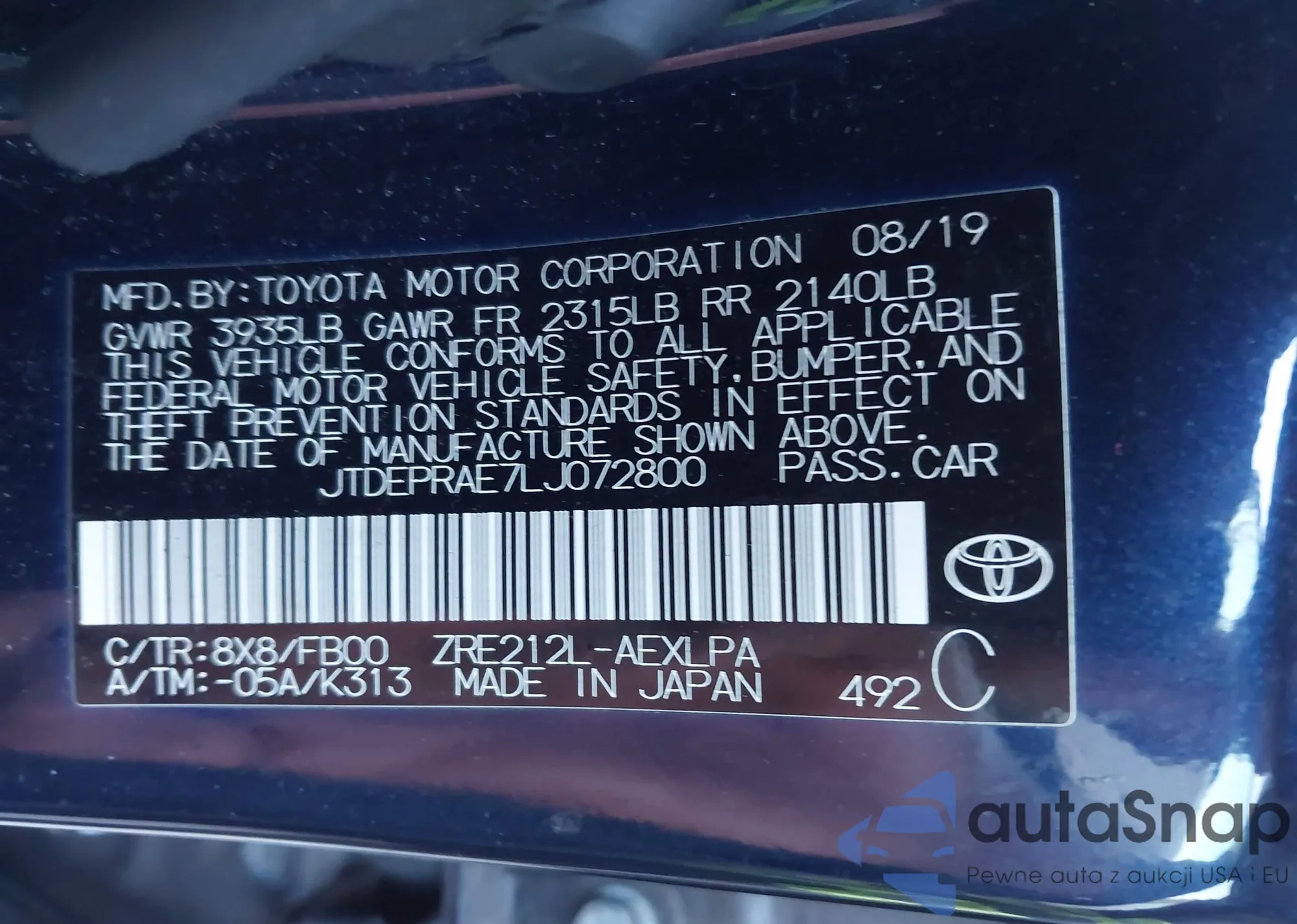 LOT: 43691320 VIN: JTDEPRAE7LJ072800