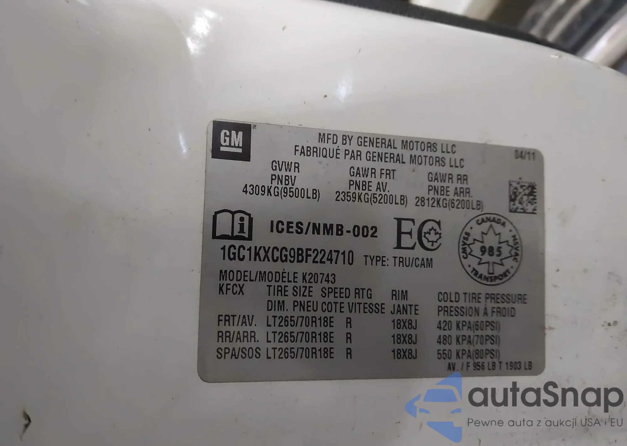 • VIN 1GC1KXCG9BF224710