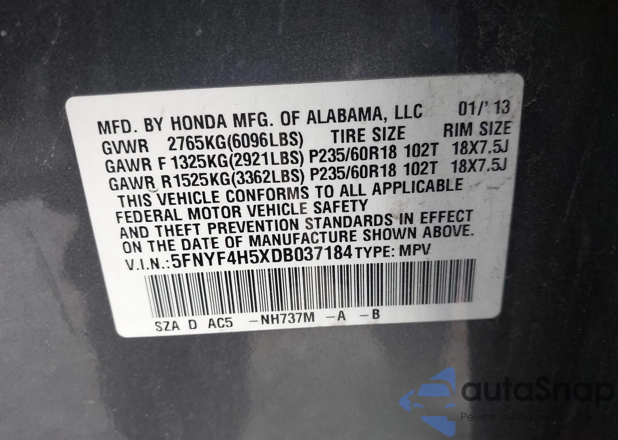 • VIN 5FNYF4H5XDB037184
