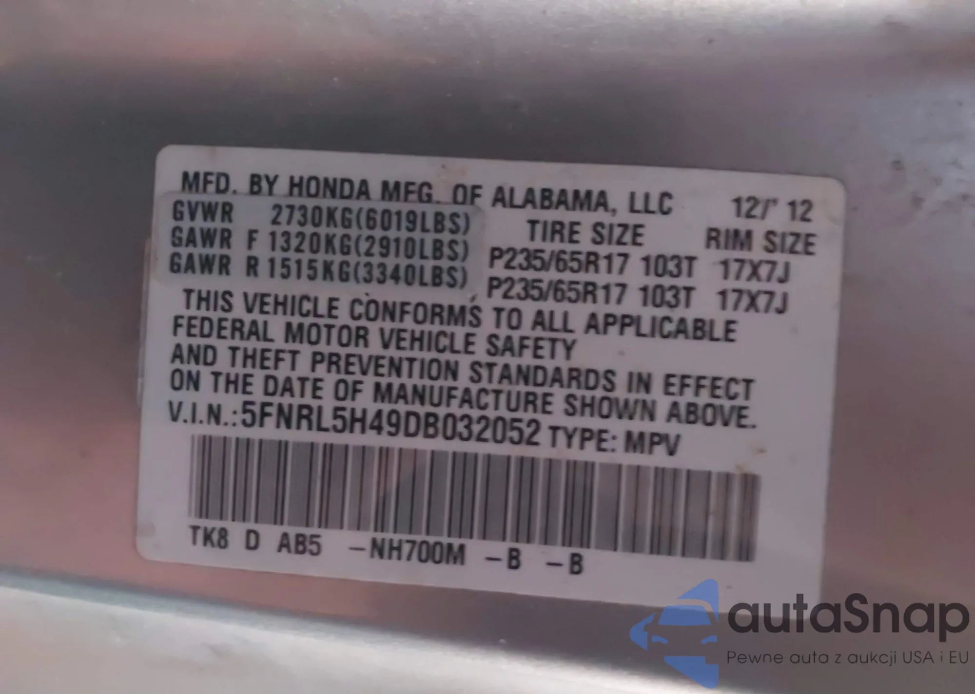 • VIN 5FNRL5H49DB032052