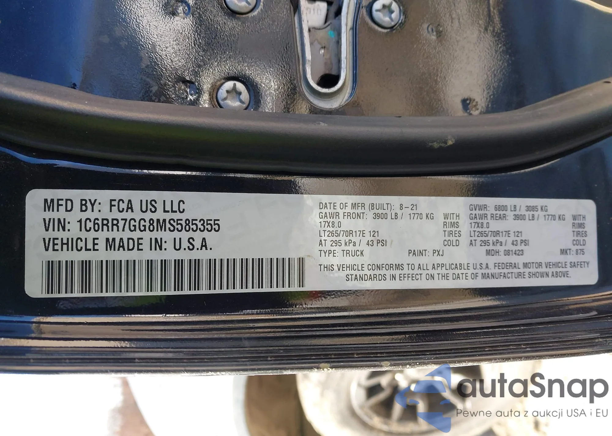 LOT: 43877499 VIN: 1C6RR7GG8MS585355