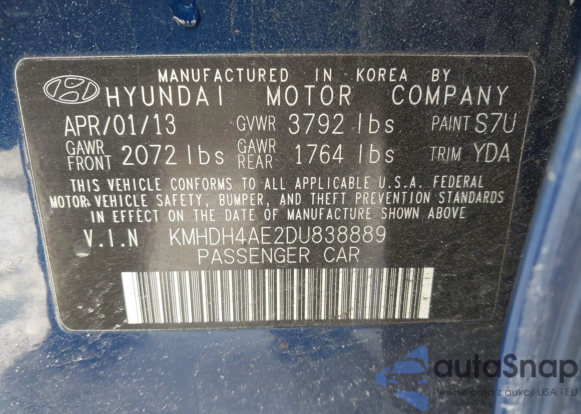 LOT: 43950235 VIN: KMHDH4AE2DU838889