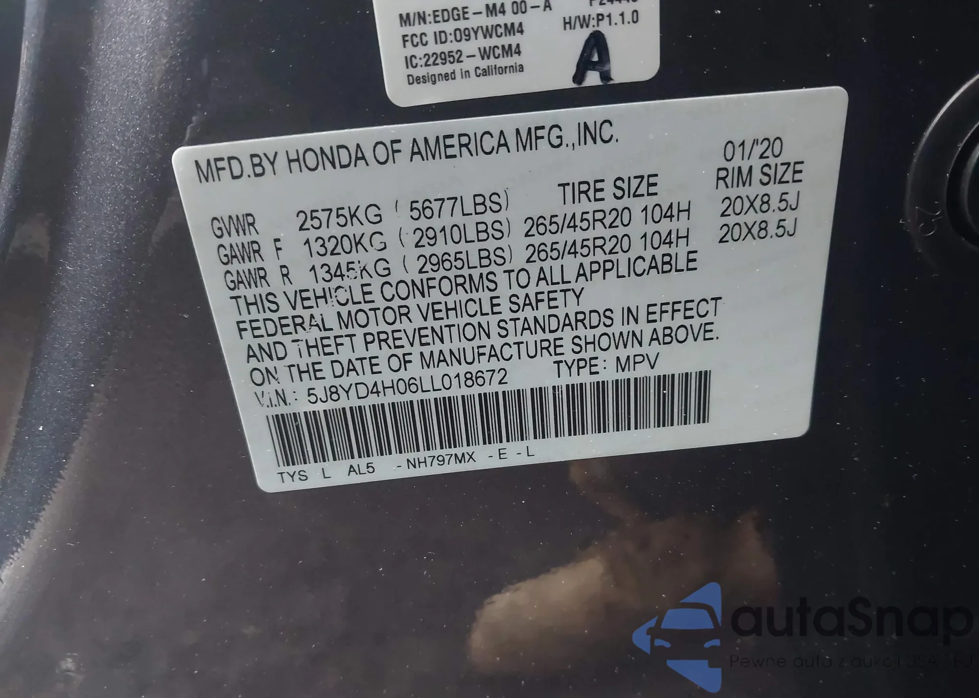 • VIN 5J8YD4H06LL018672