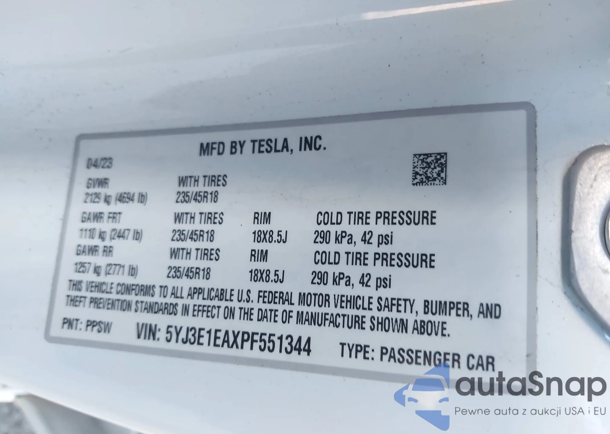 LOT: 43697923 VIN: 5YJ3E1EAXPF551344