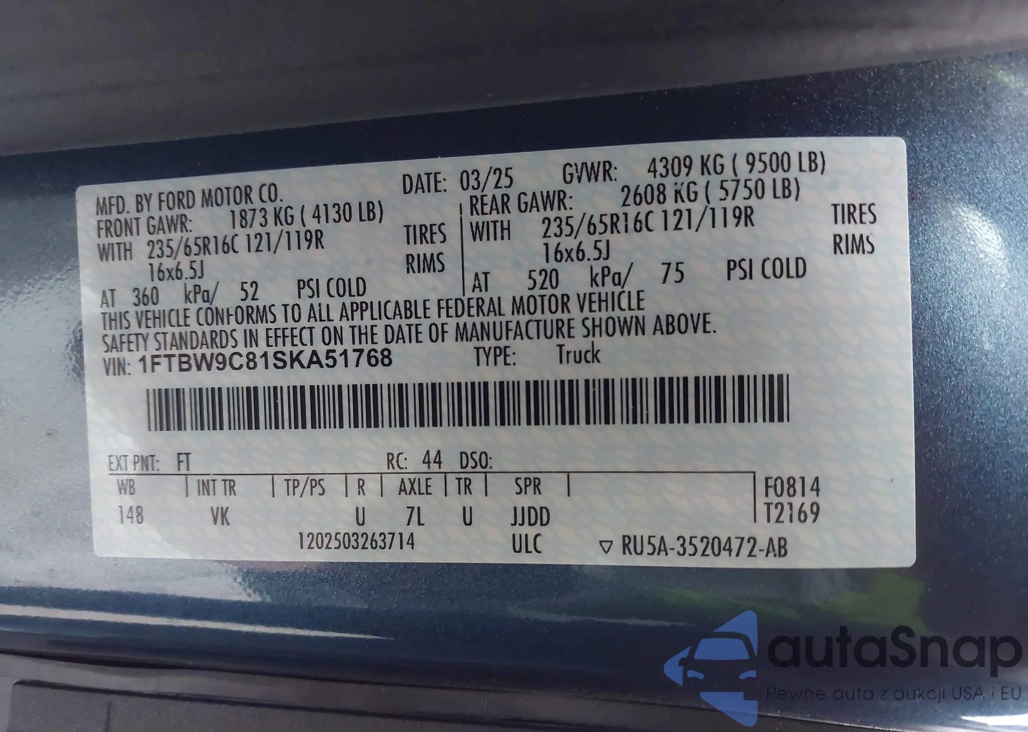 LOT: 44101826 VIN: 1FTBW9C81SKA51768