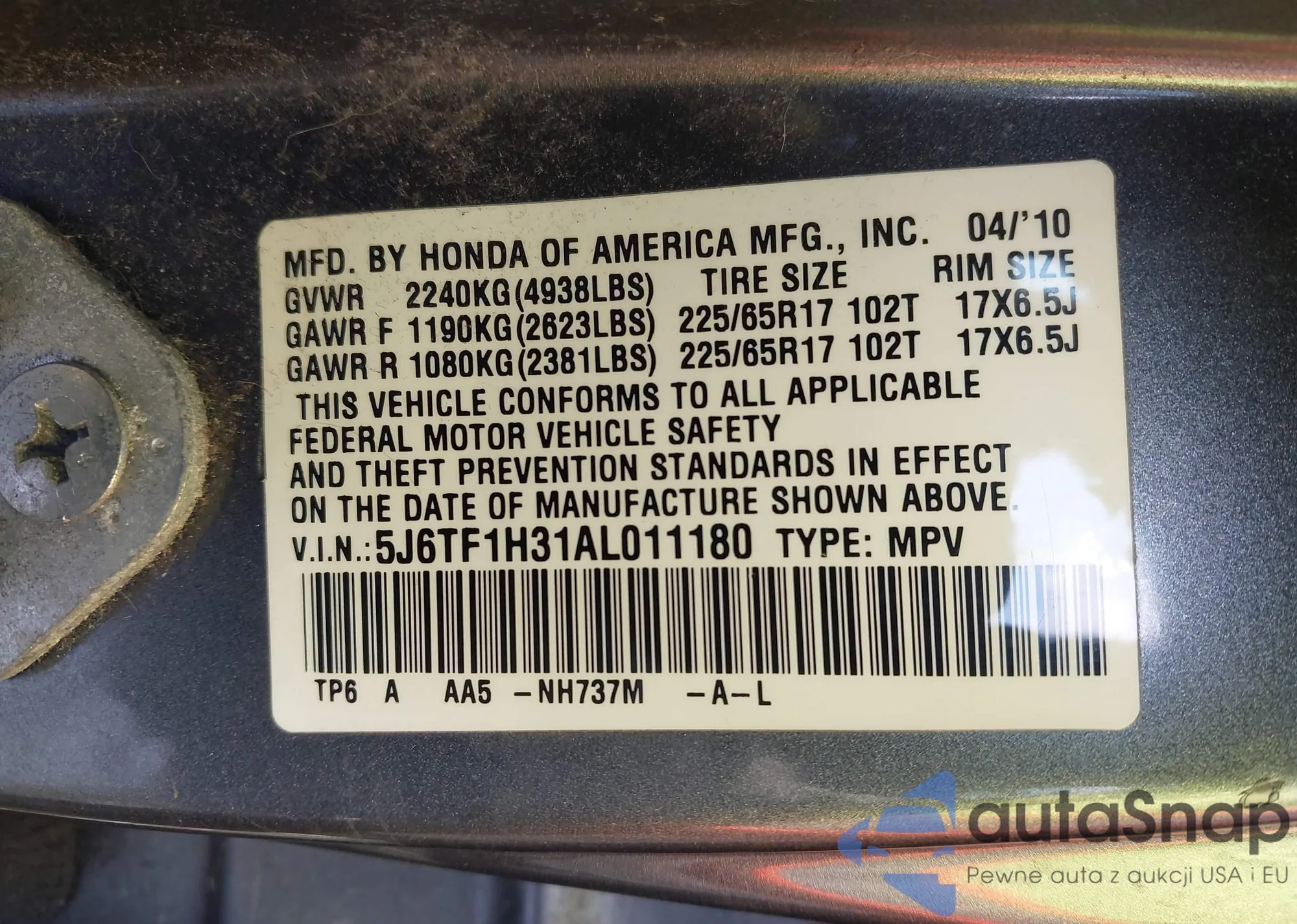 • VIN 5J6TF1H31AL011180