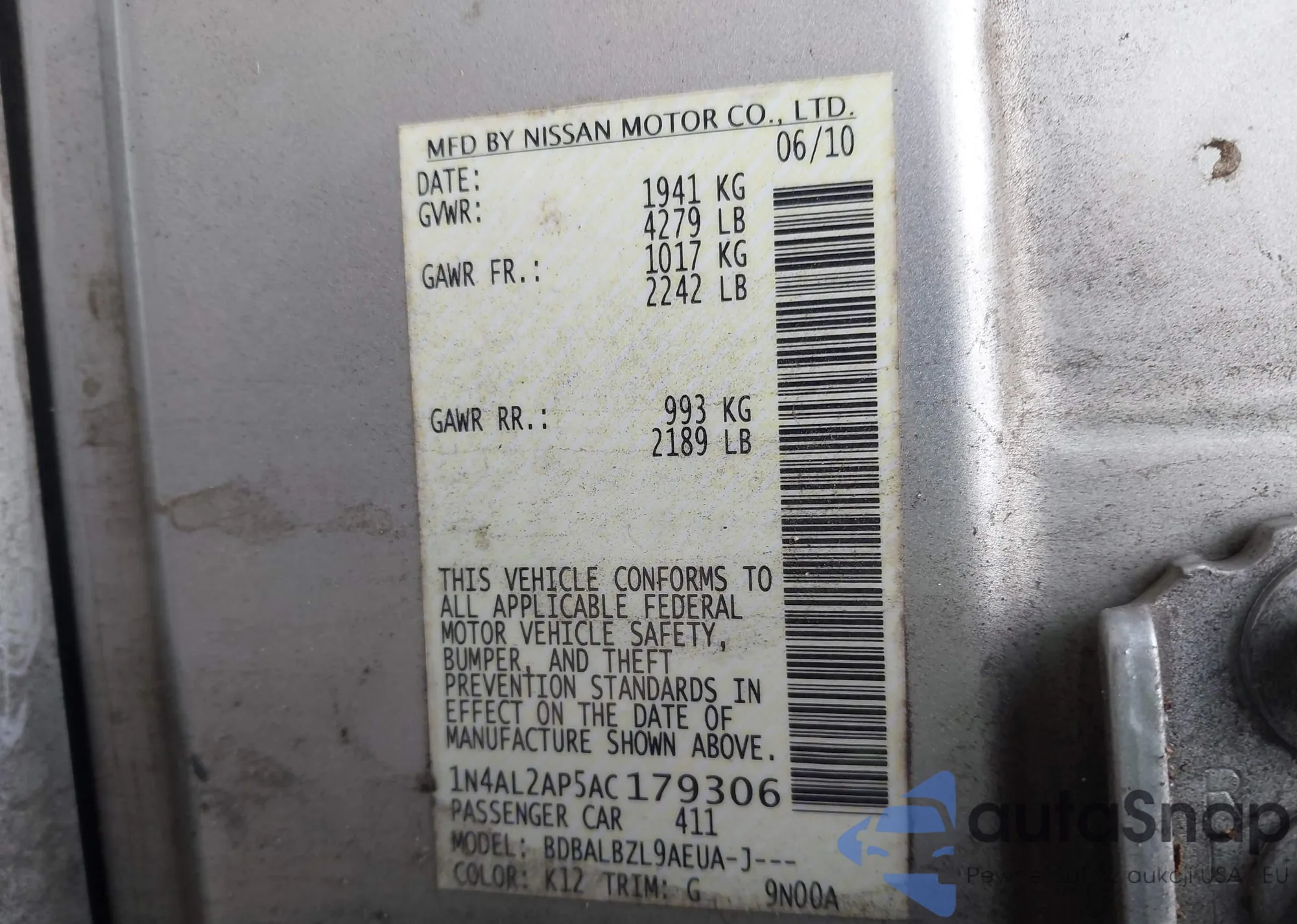 LOT: 43880352 VIN: 1N4AL2AP5AC179306