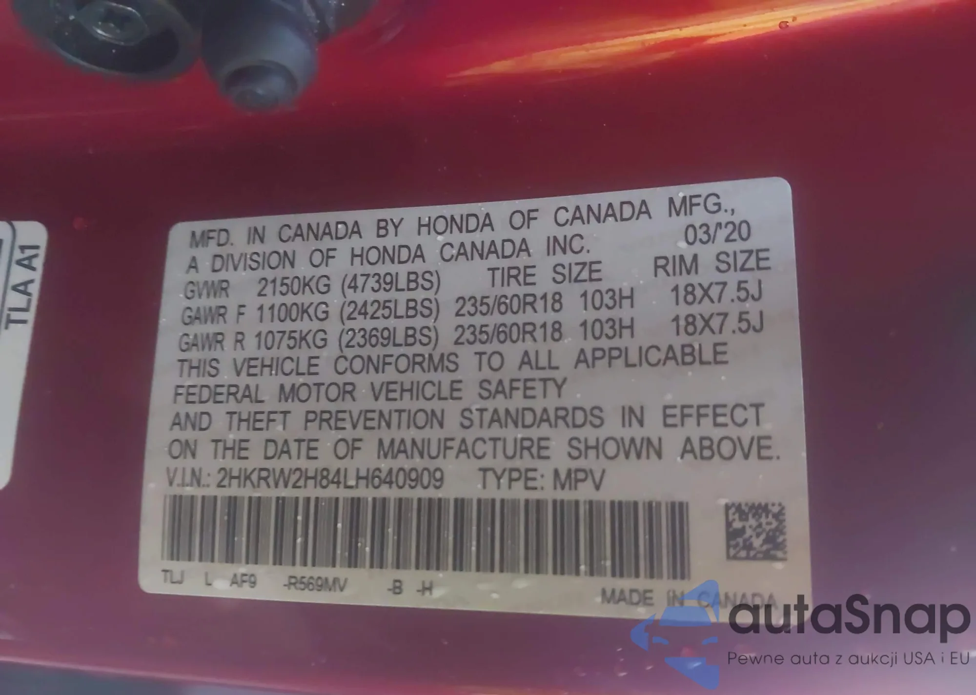 LOT: 43902786 VIN: 2HKRW2H84LH640909