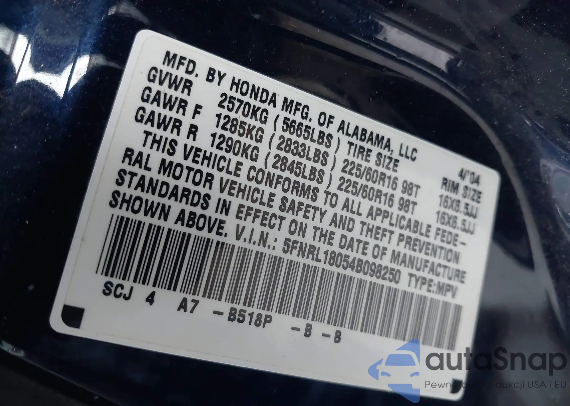 • VIN 5FNRL18054B098250