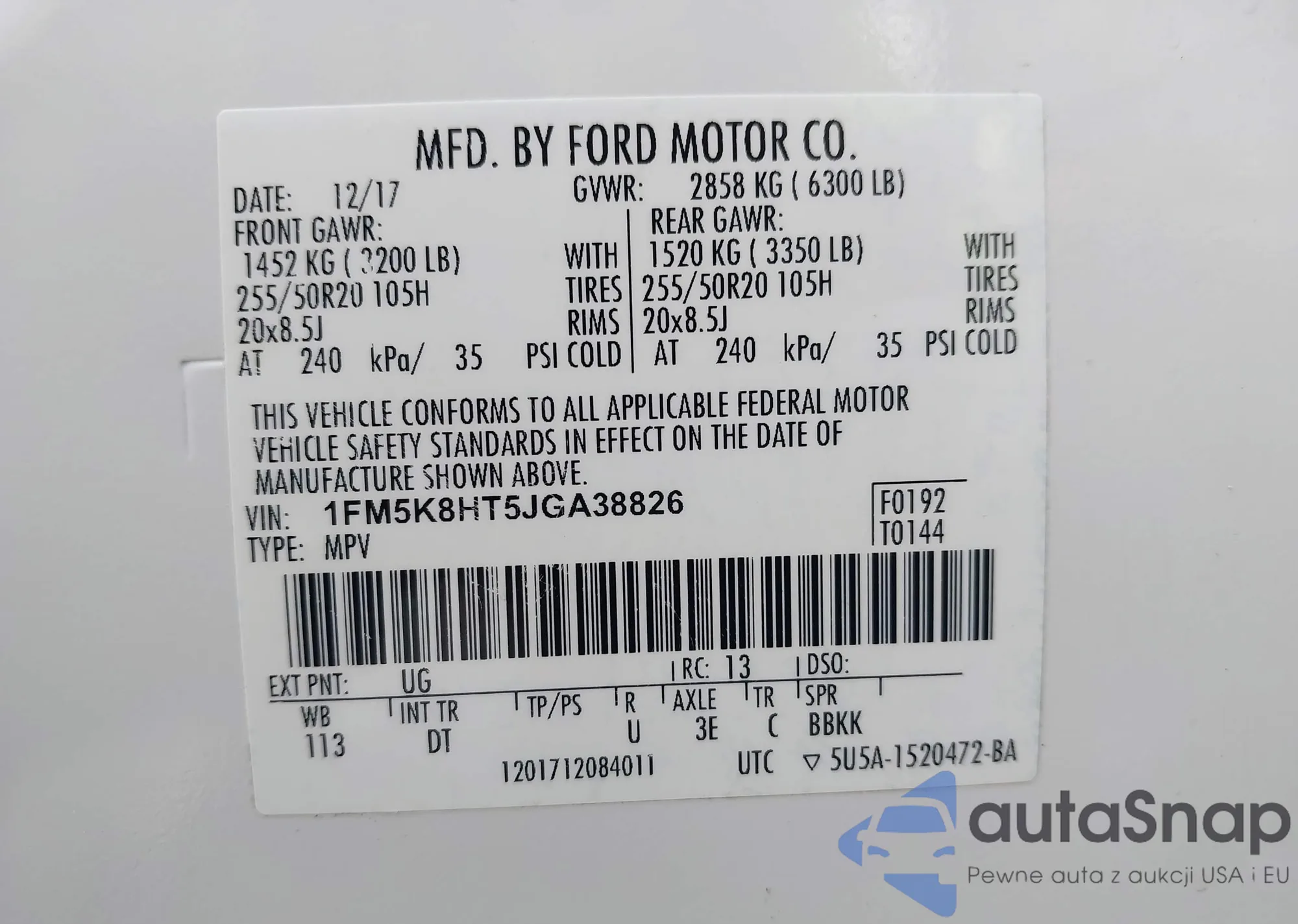LOT: 44189382 VIN: 1FM5K8HT5JGA38826