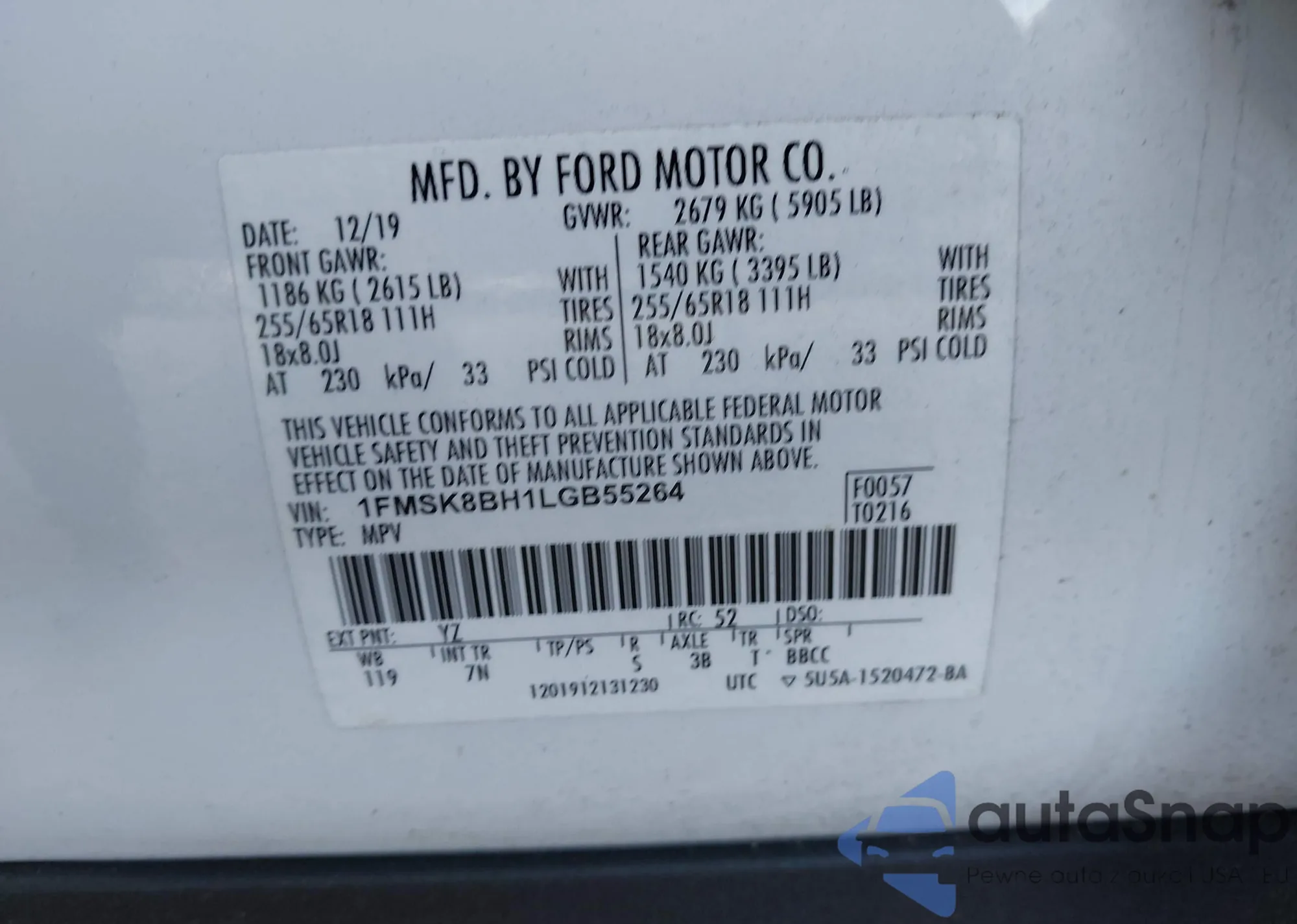LOT: 43607063 VIN: 1FMSK8BH1LGB55264