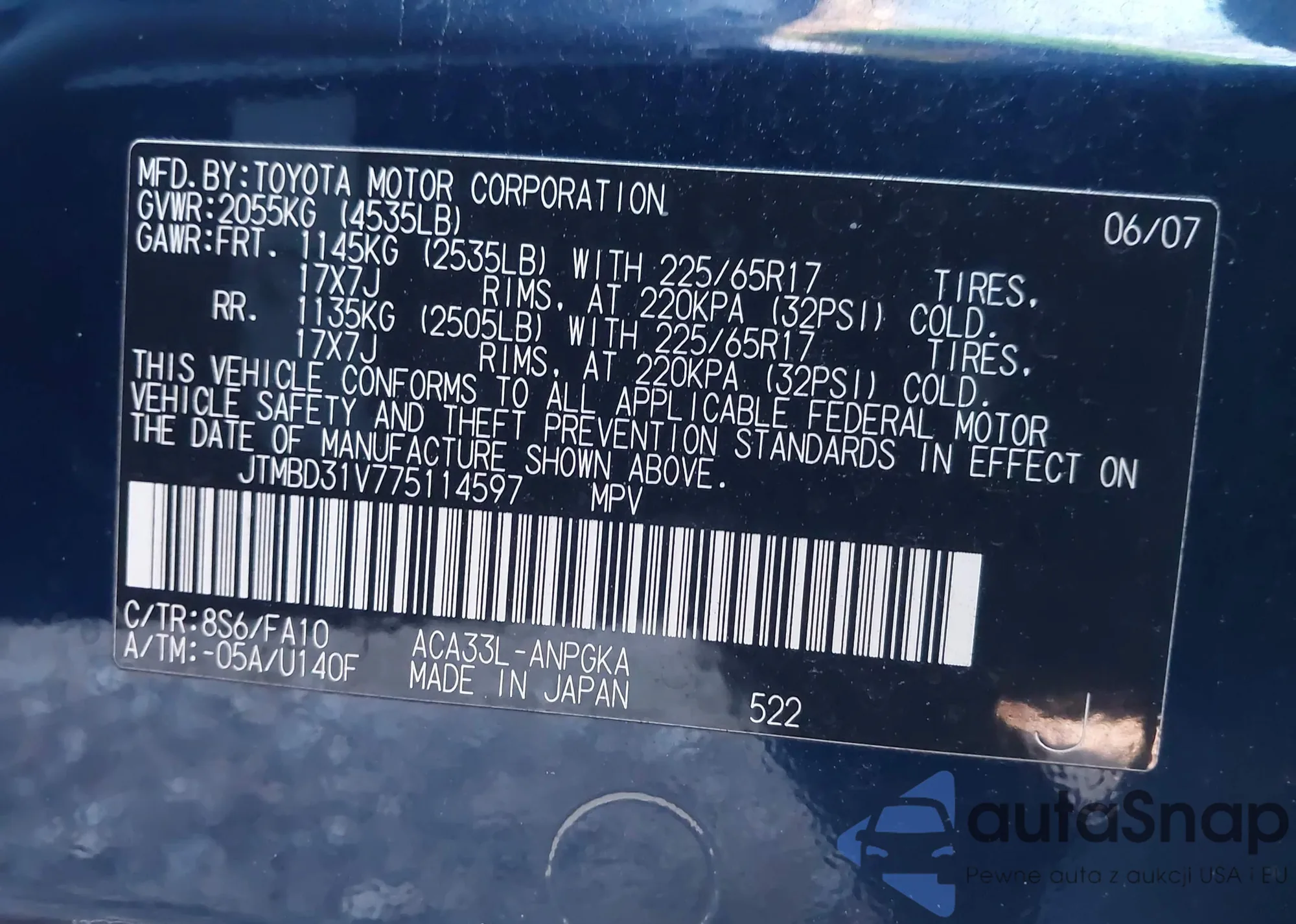 LOT: 44033183 VIN: JTMBD31V775114597