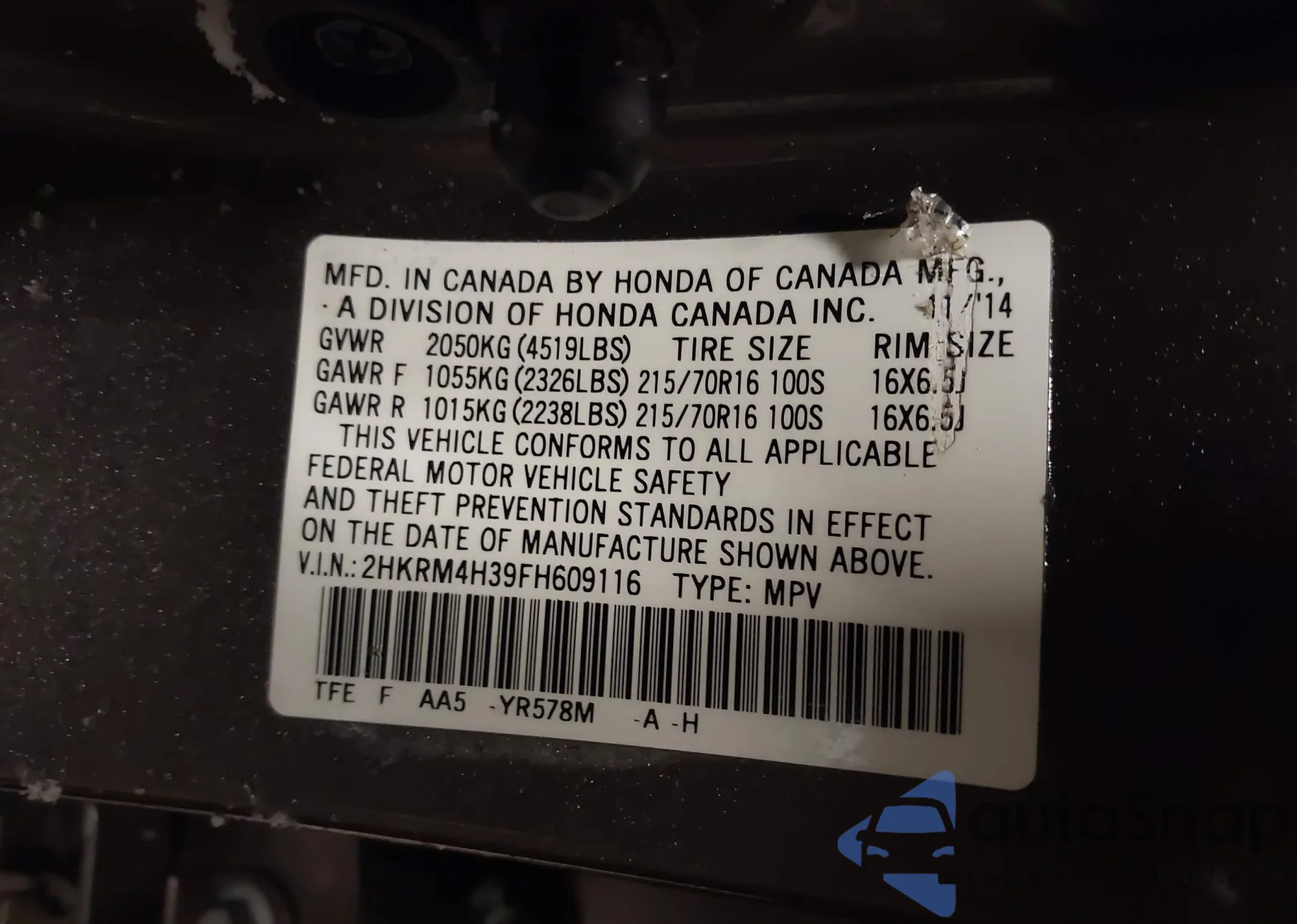 • VIN 2HKRM4H39FH609116