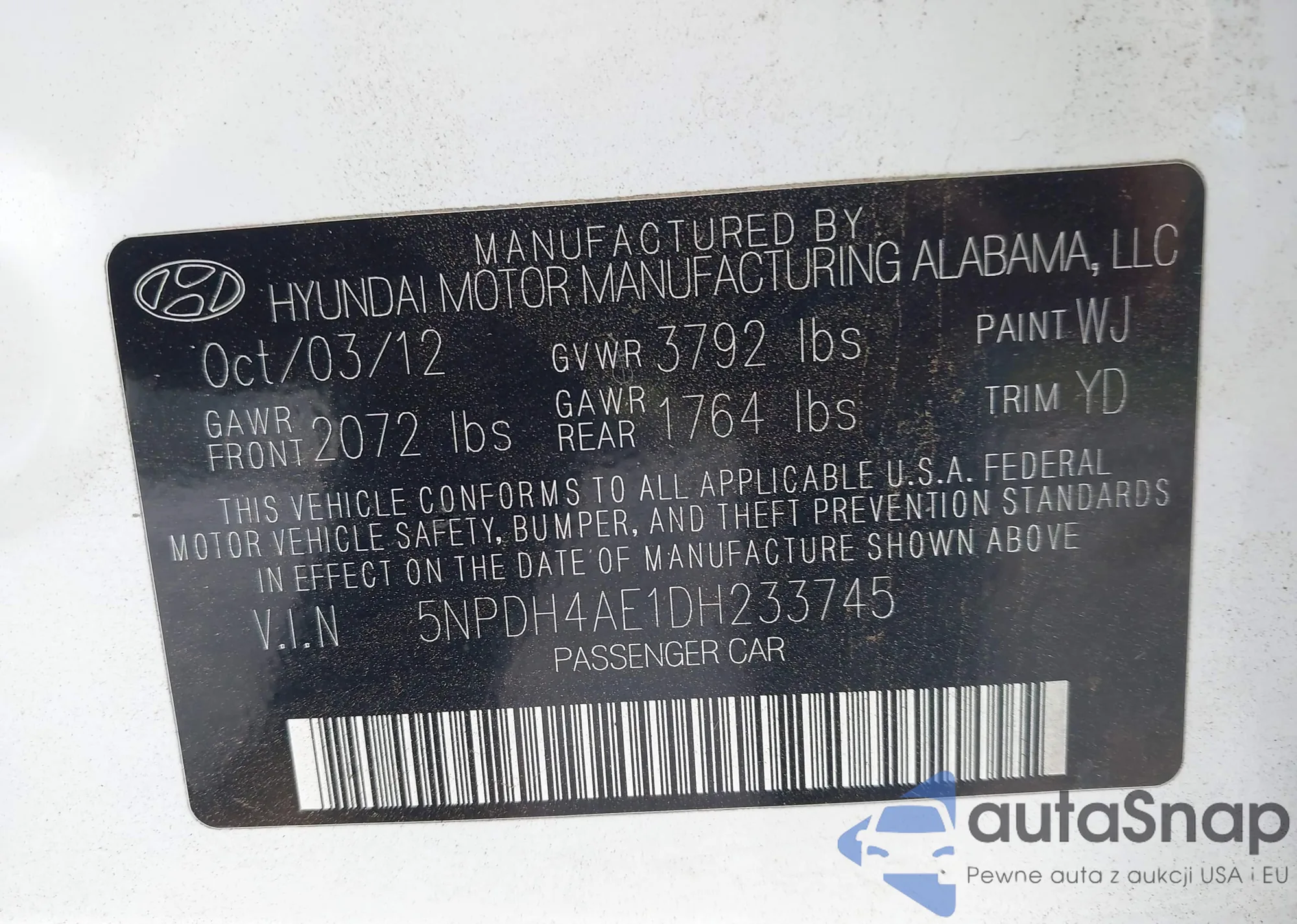 LOT: 43893558 VIN: 5XXGN4A78DG091865