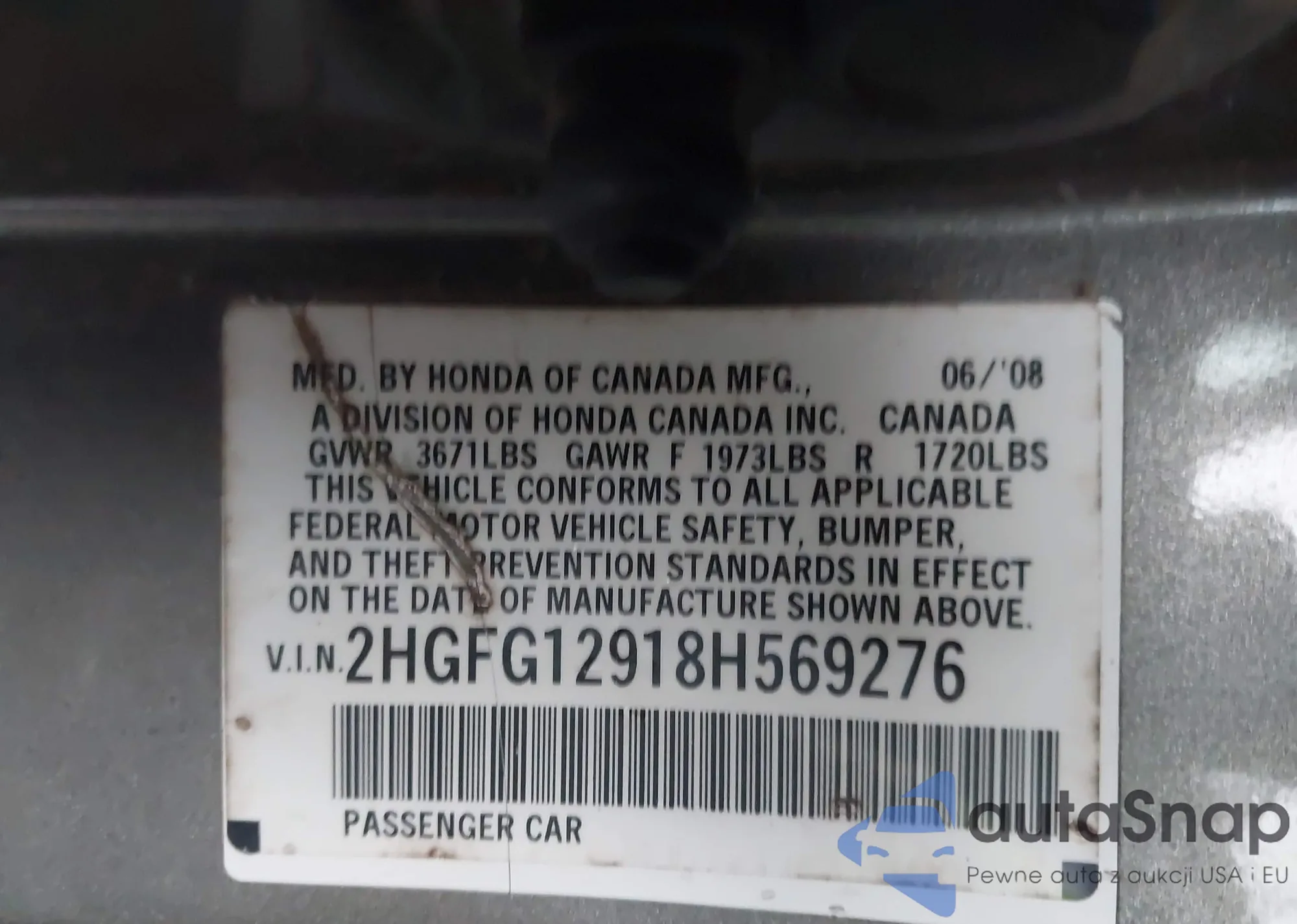 LOT: 44106536 VIN: 2HGFG12918H569276