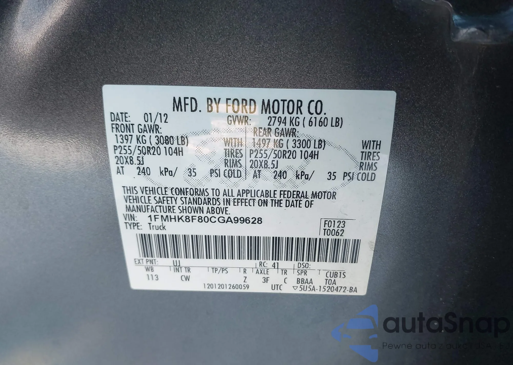LOT: 44184334 VIN: 1FMHK8F80CGA99628