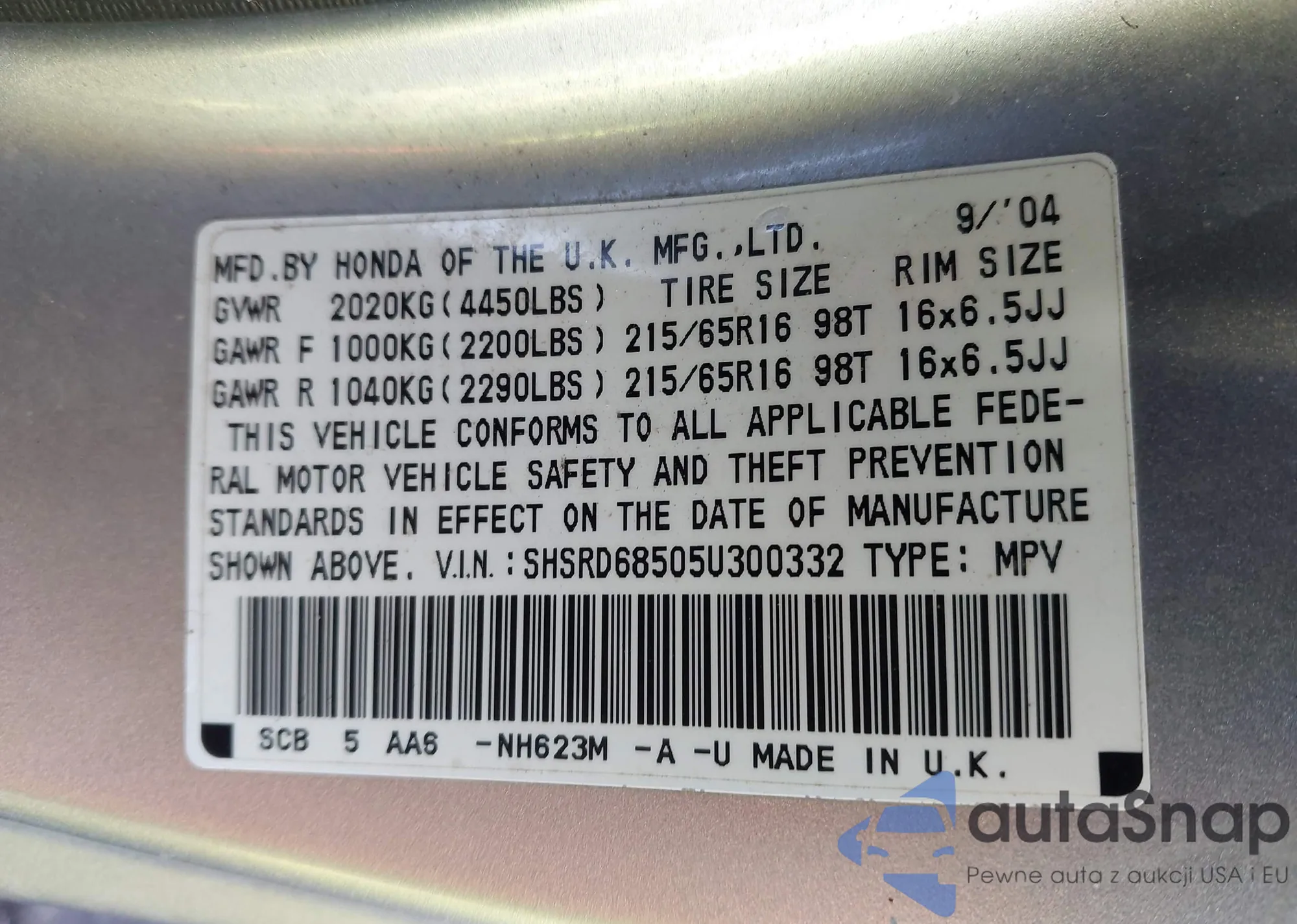 • VIN 2HKRL1868XH548807