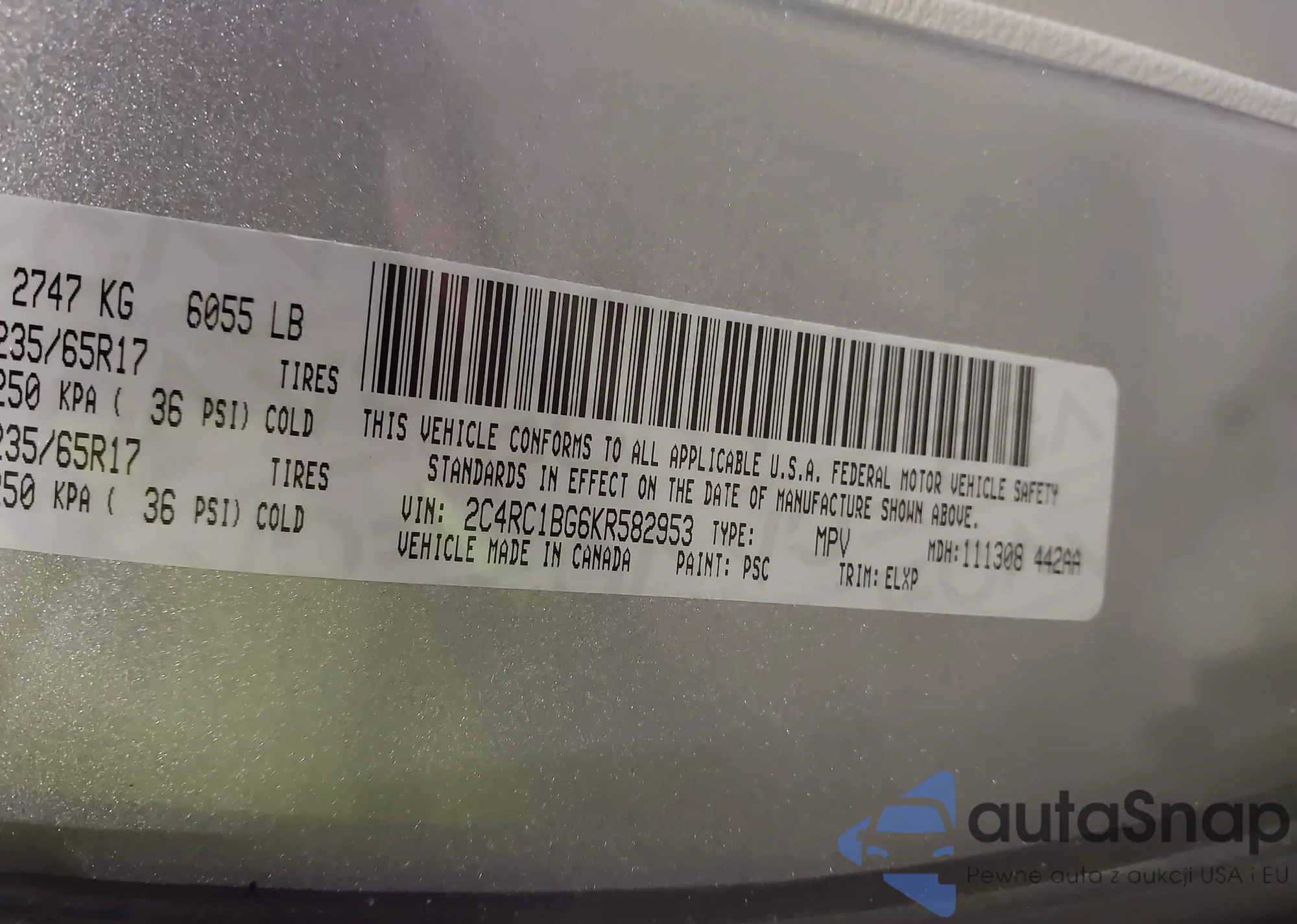 • VIN 2C4RC1BG6KR582953