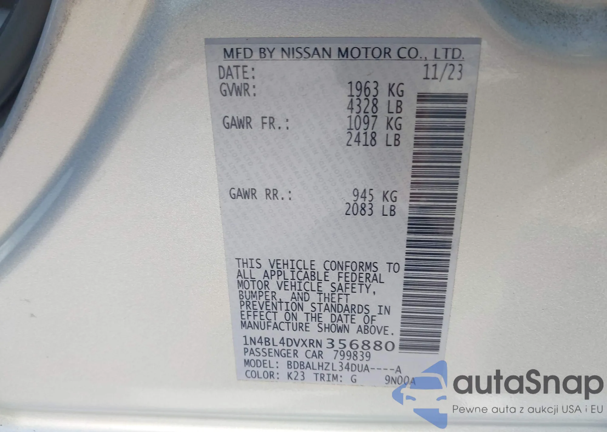 LOT: 44274840 VIN: 1N4BL4DVXRN356880