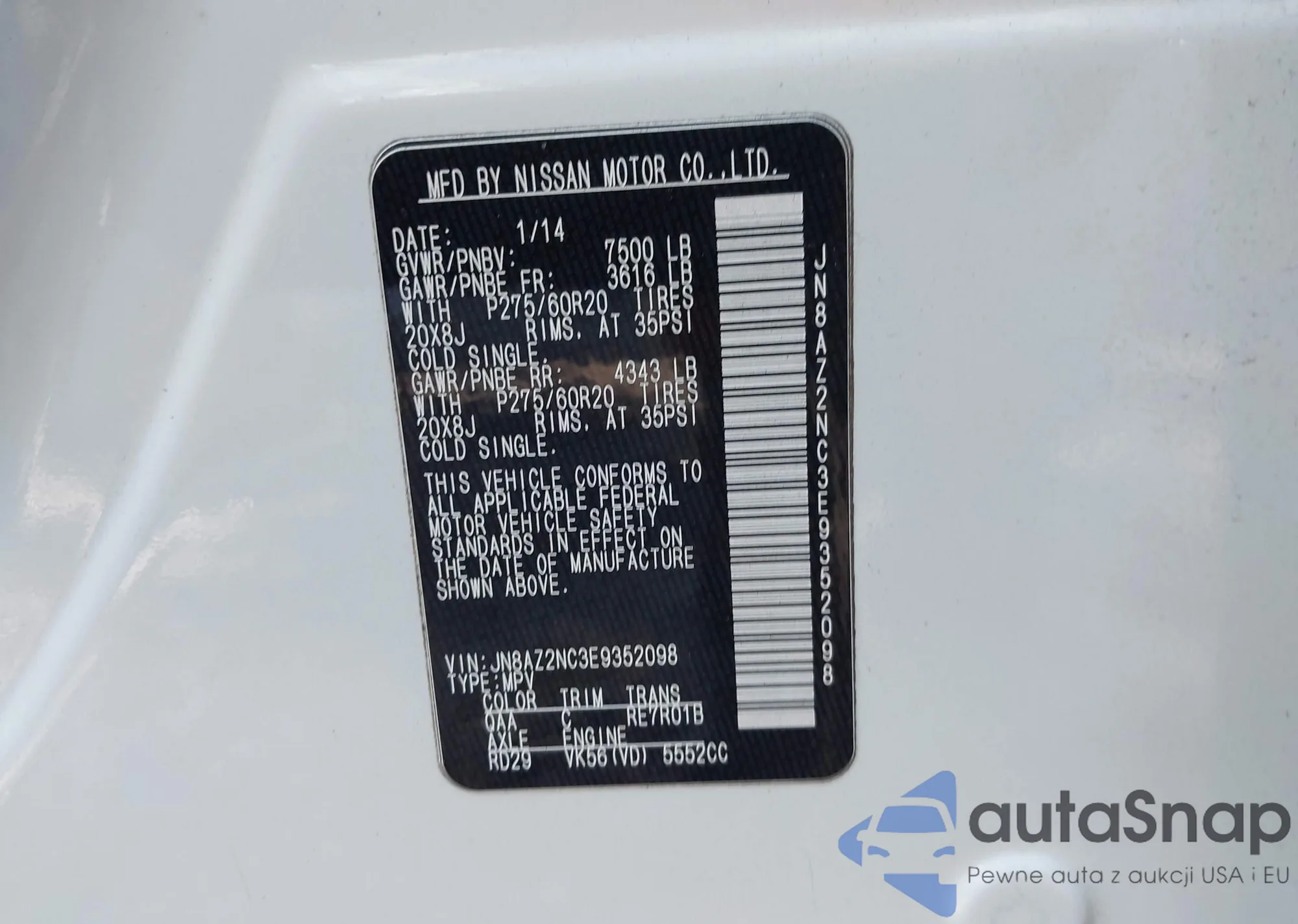 • VIN JN8AZ2NC3E9352098