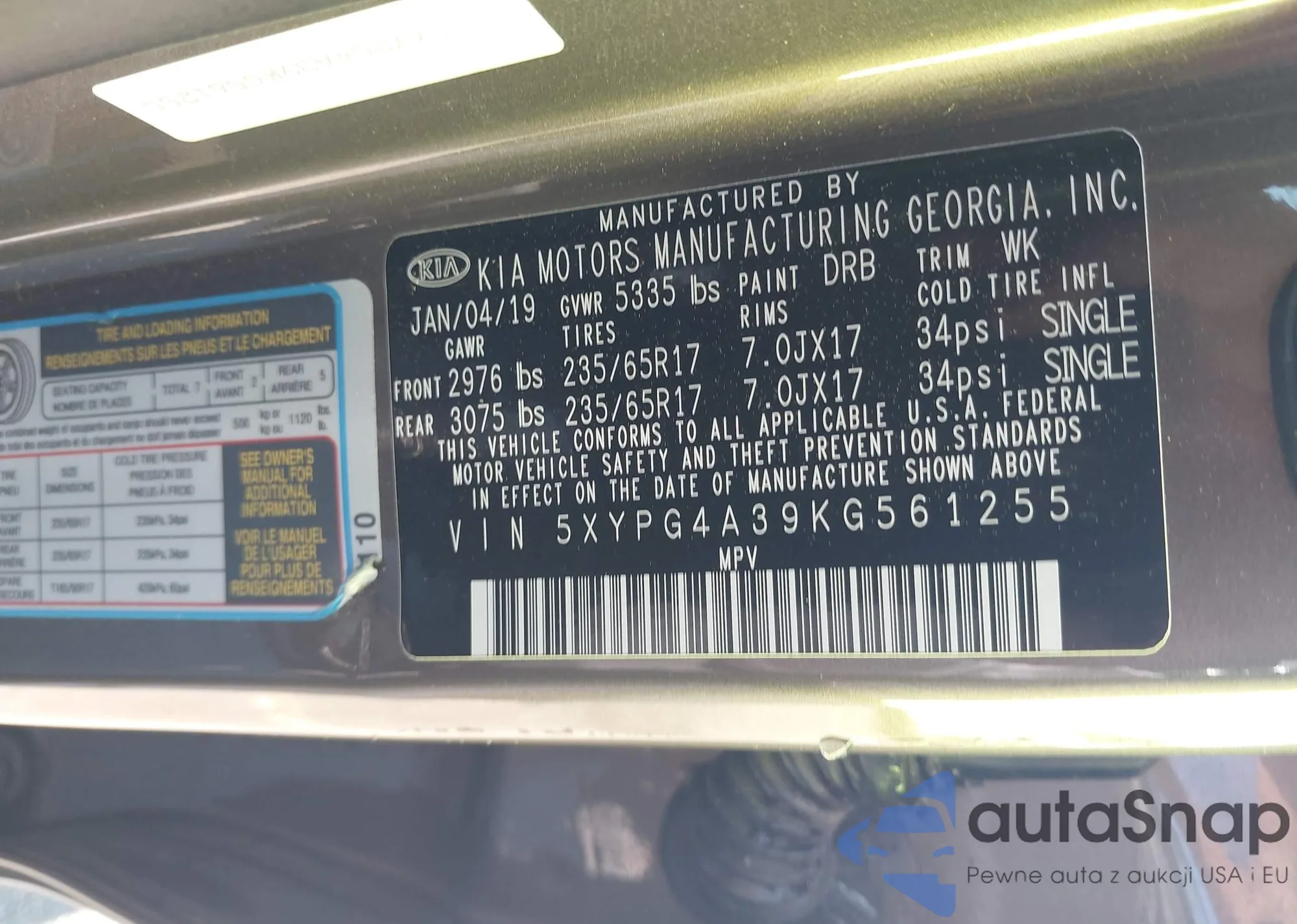 LOT: 43953515 VIN: 5XYPG4A36KG517679