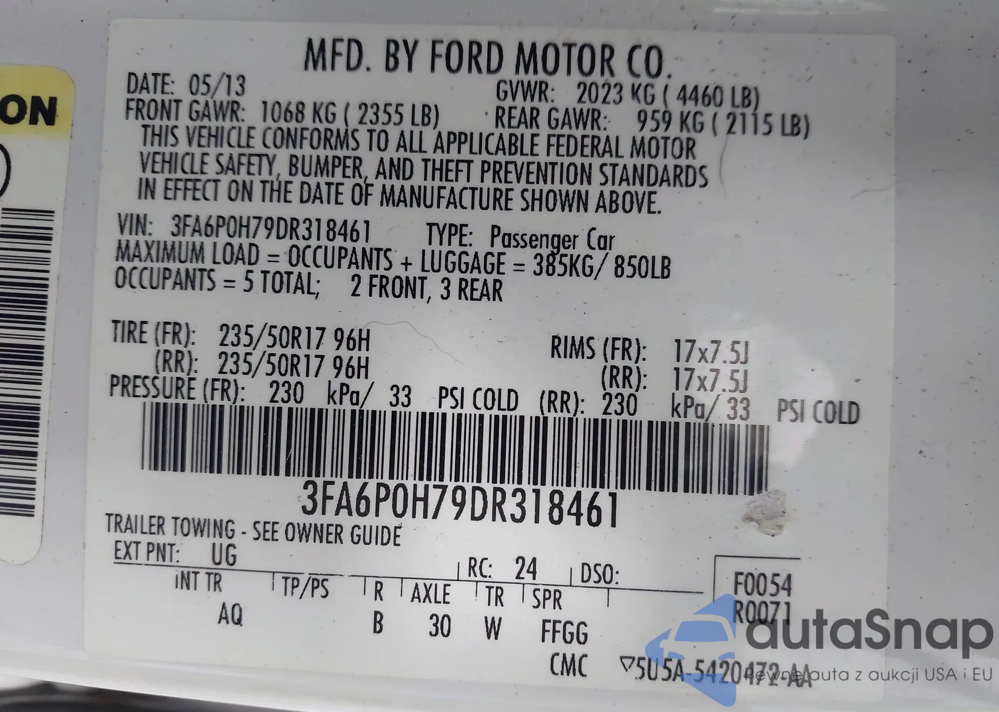 LOT: 43939856 VIN: 3FA6P0H79DR318461