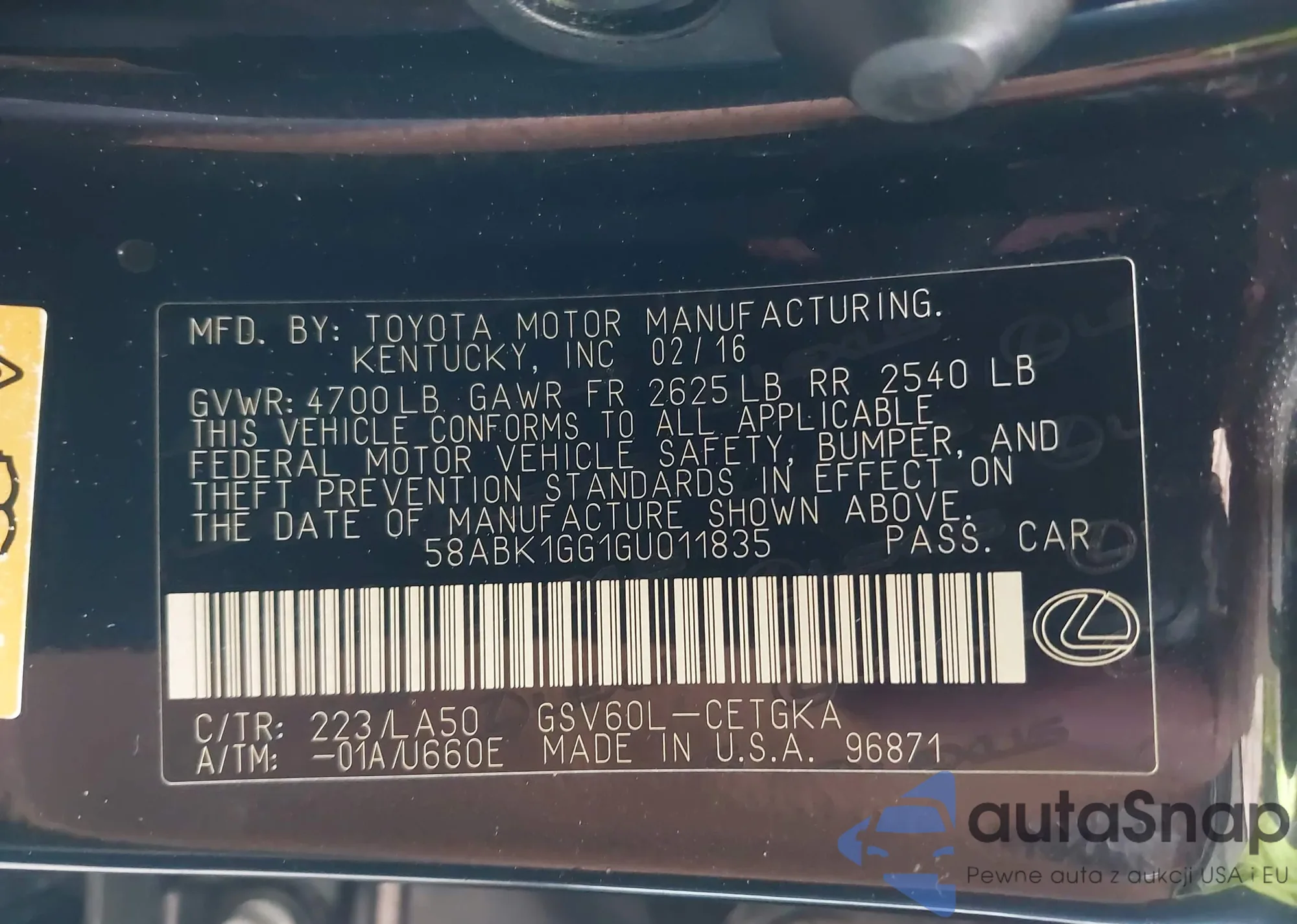 LOT: 43728995 VIN: 58ABK1GG1GU011835