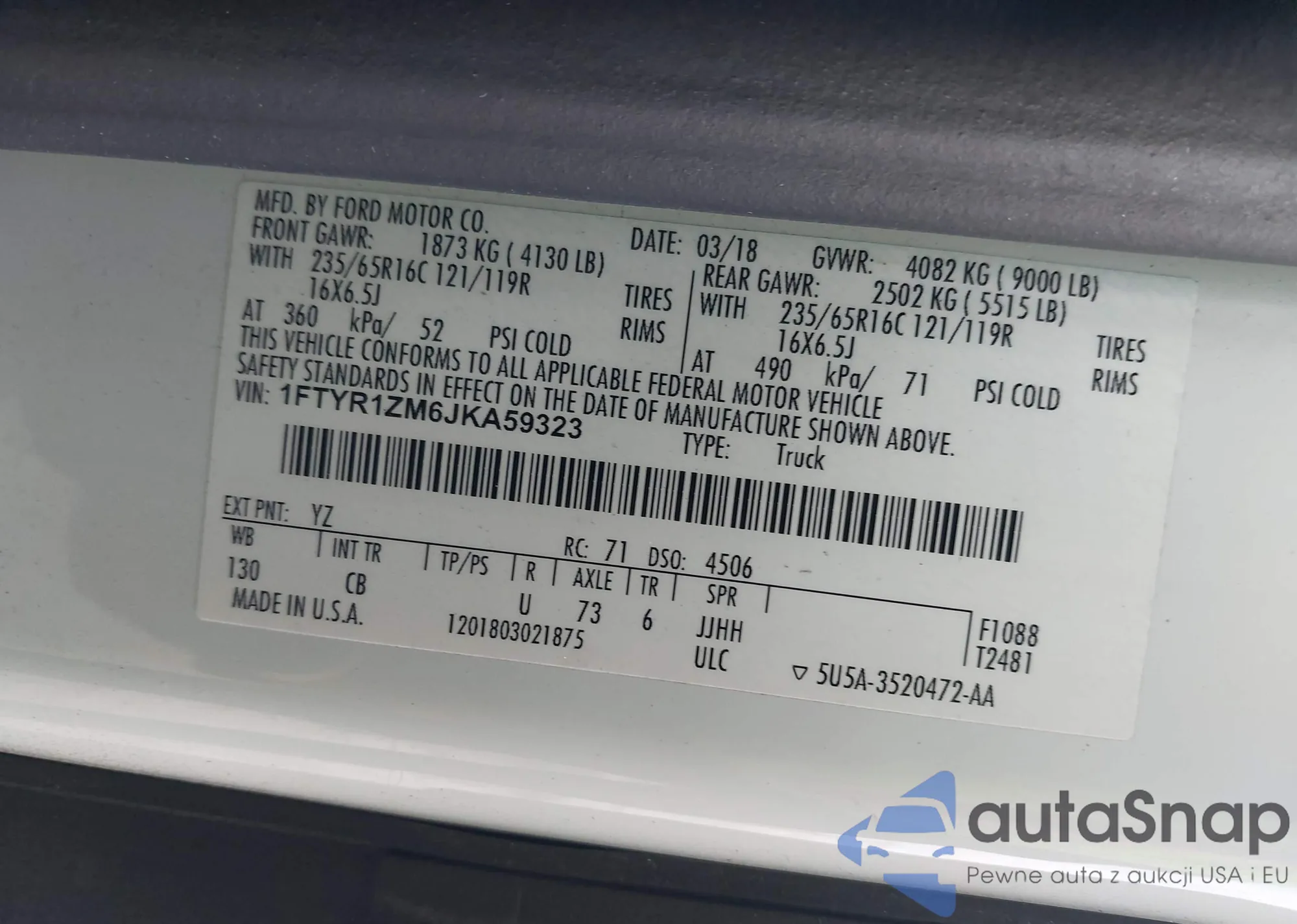 • VIN 1FTYR1ZM6JKA59323